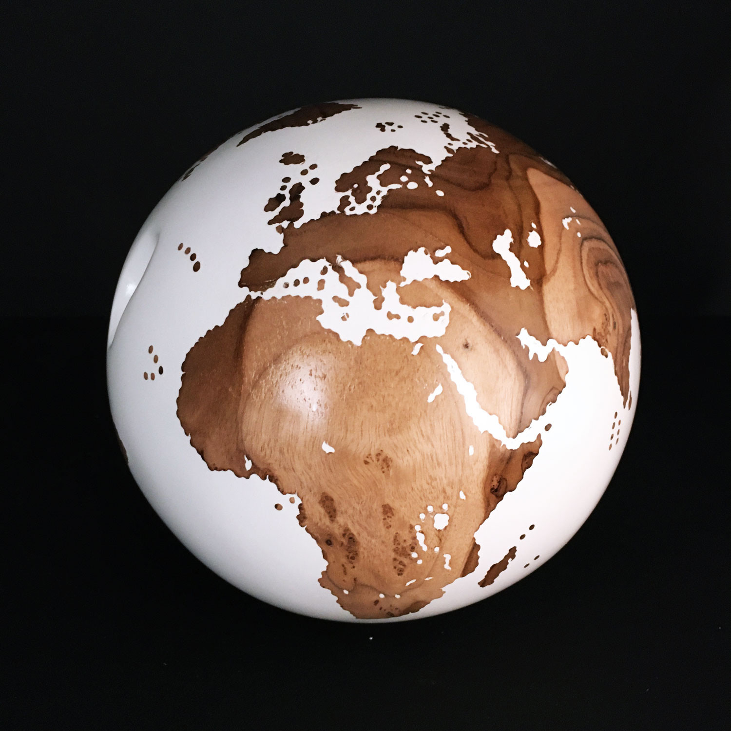 The exclusive handcrafted globe was created with sustainable teak root. The finish features oceans in 150-layer smooth white acrylic resin and continents that have been fine-sanded smooth and clear coated, so you can appreciate the beautiful and distinctive natural grain of the teak root.