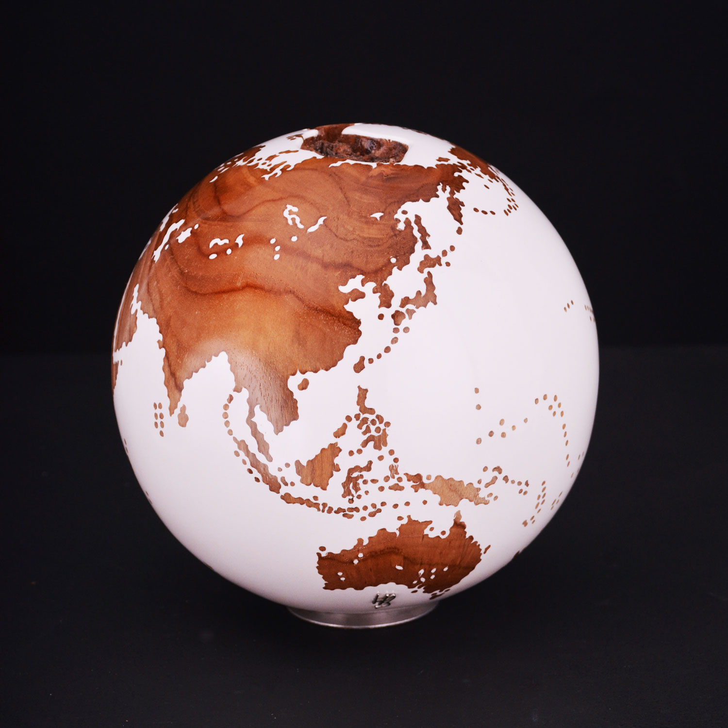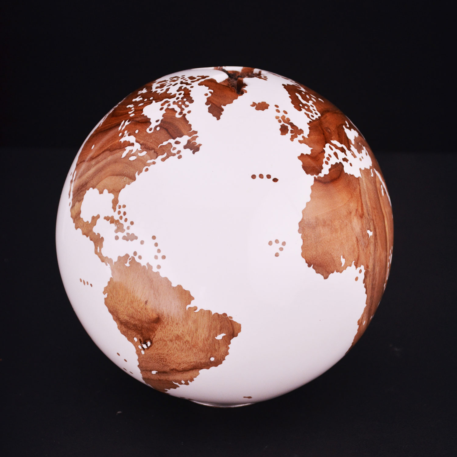 The exclusive handcrafted globe was created with sustainable teak root. The finish features oceans in 150-layer smooth white acrylic resin and continents that have been fine-sanded smooth and clear coated, so you can appreciate the beautiful and distinctive natural grain of the teak root.