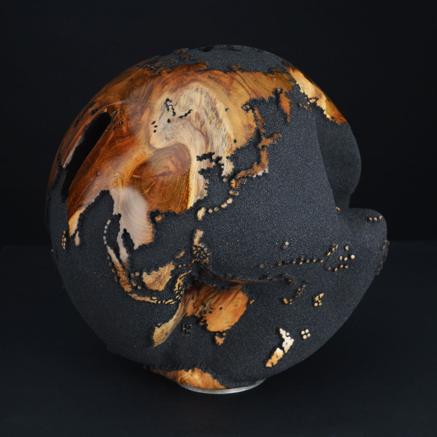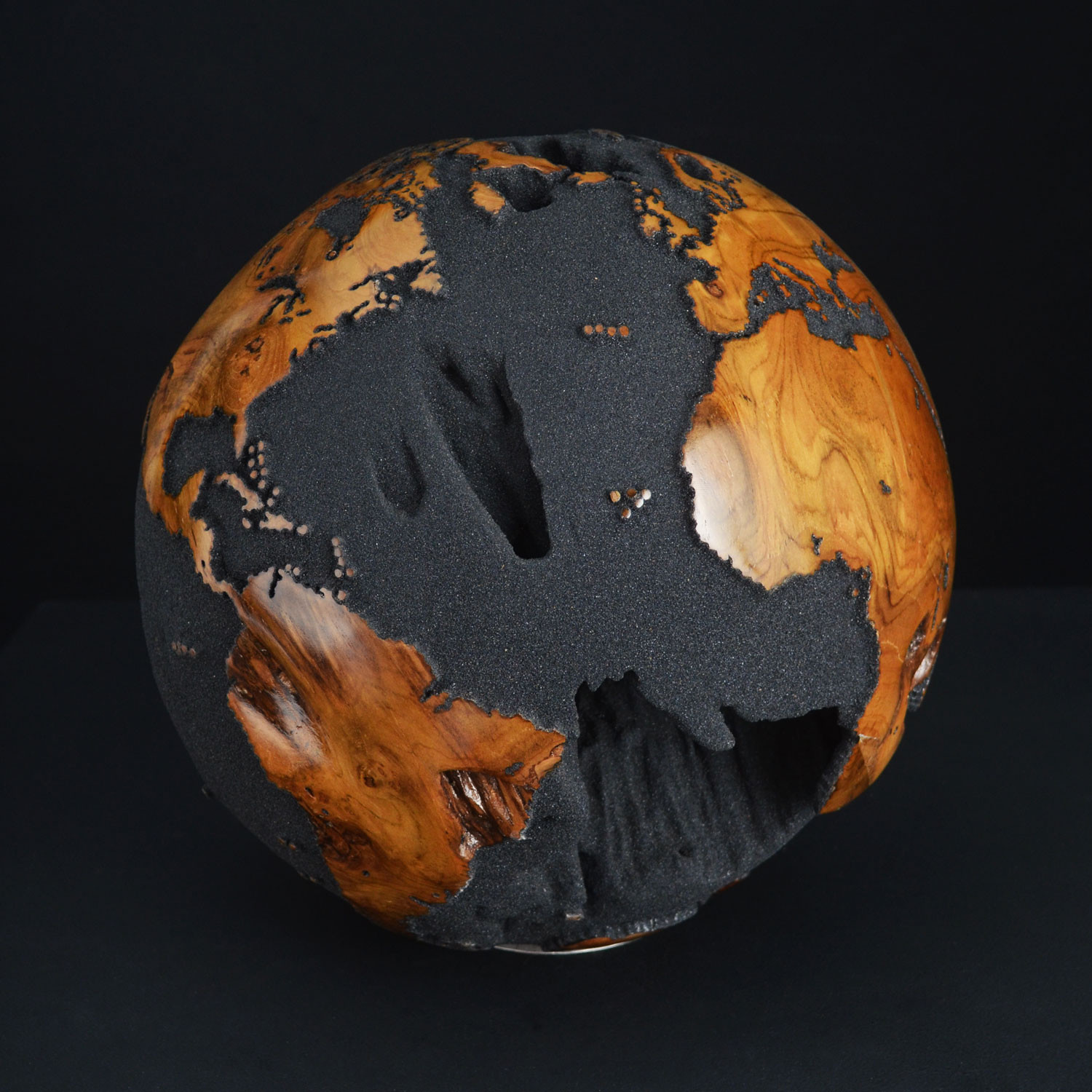 The exclusive handcrafted globe was created with sustainable teak root. The finish features oceans in black magmatic sand originating from Bali's volcanic coasts and continents that have been fine-sanded smooth and clear coated, so you can appreciate the beautiful and distinctive natural grain of the teak root.