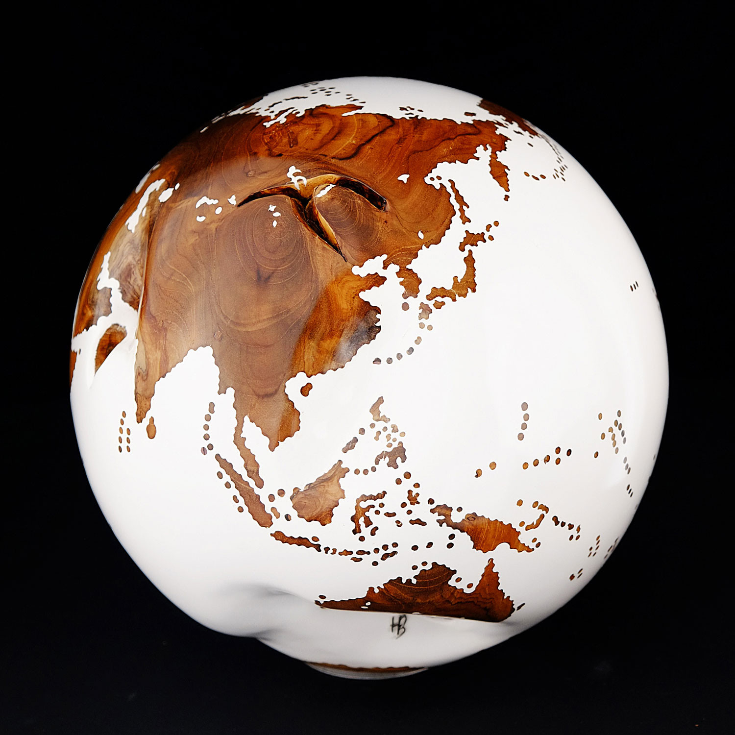 The exclusive handcrafted globe was created with sustainable teak root. The finish features oceans in 150-layer smooth white acrylic resin and continents that have been fine-sanded smooth and clear coated, so you can appreciate the beautiful and distinctive natural grain of the teak root.