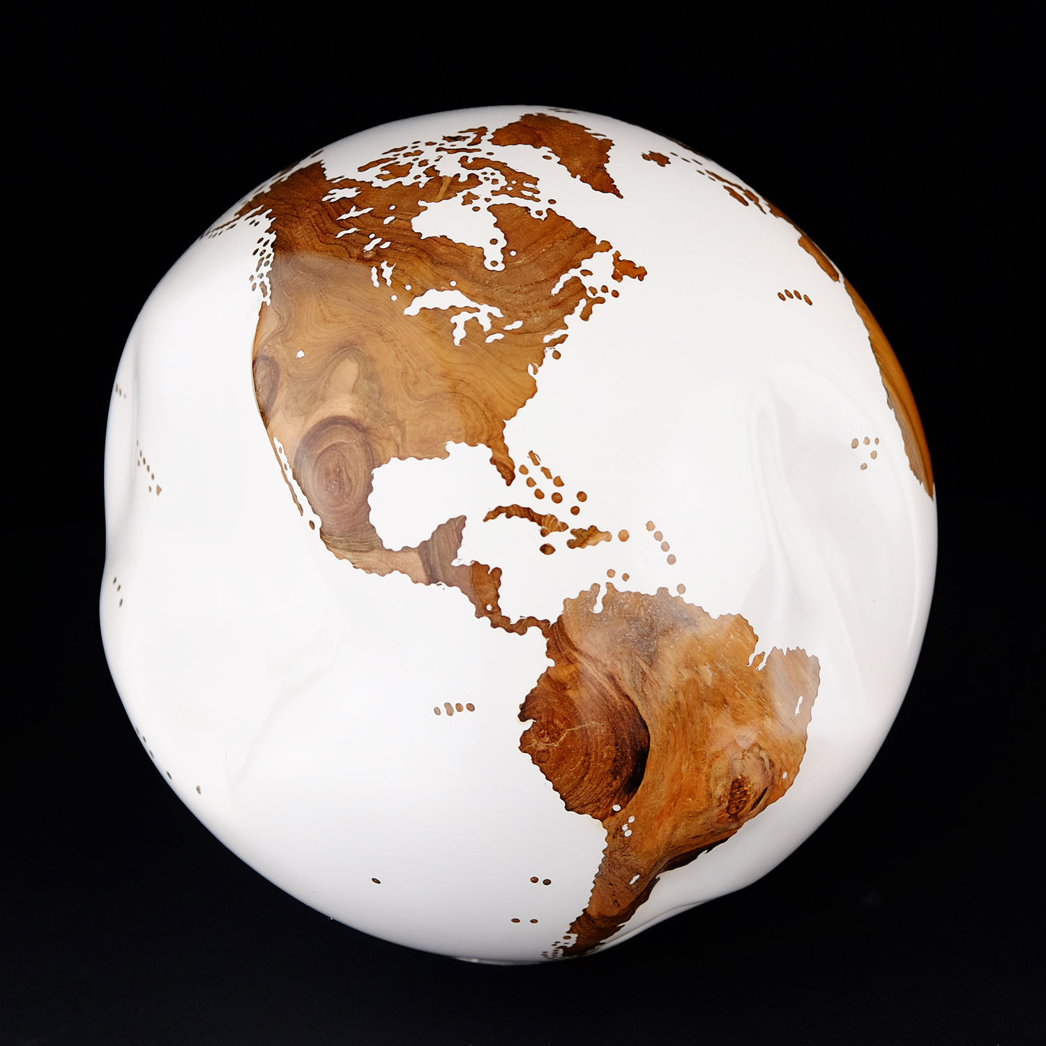 The exclusive handcrafted globe was created with sustainable teak root. The finish features oceans in 150-layer smooth white acrylic resin and continents that have been fine-sanded smooth and clear coated, so you can appreciate the beautiful and distinctive natural grain of the teak root.