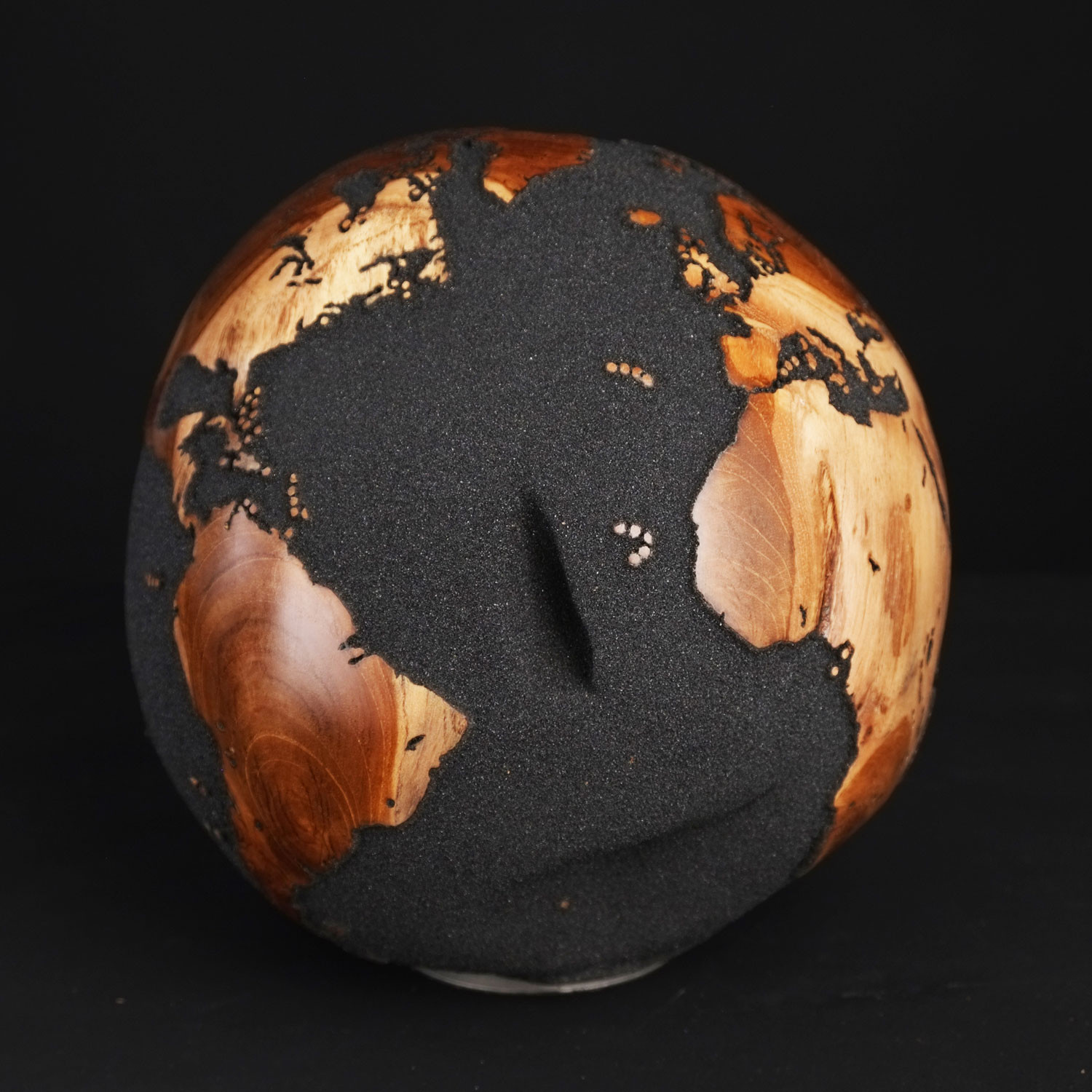 The exclusive handcrafted globe was created with sustainable teak root. The finish features oceans in black magmatic sand originating from Bali's volcanic coasts and continents that have been fine-sanded smooth and clear coated, so you can appreciate the beautiful and distinctive natural grain of the teak root.