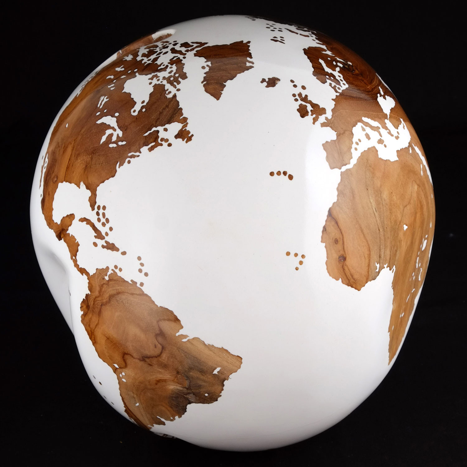 The exclusive handcrafted globe was created with sustainable teak root. The finish features oceans in 150-layer smooth white acrylic resin and continents that have been fine-sanded smooth and clear coated, so you can appreciate the beautiful and distinctive natural grain of the teak root.