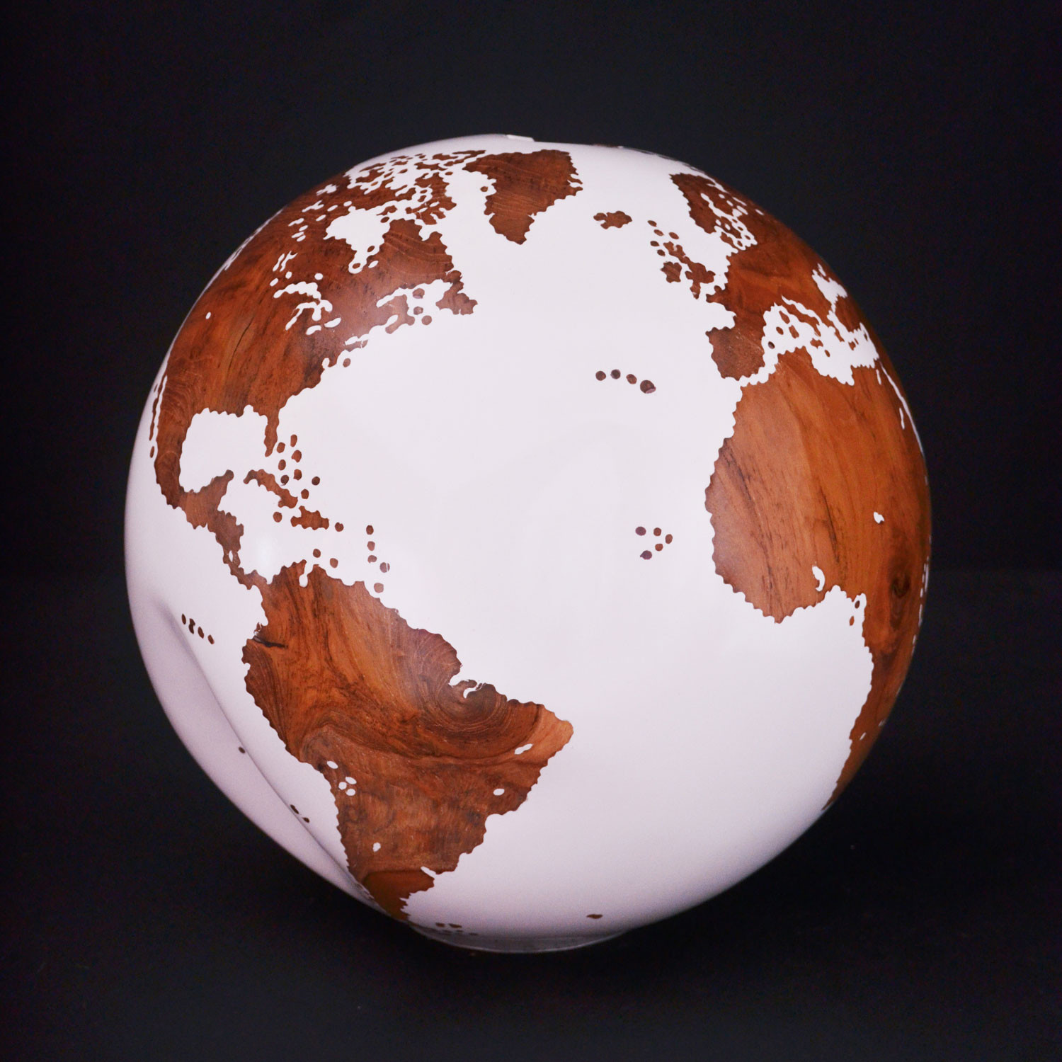 The exclusive handcrafted globe was created with sustainable teak root. The finish features oceans in 150-layer smooth white acrylic resin and continents that have been fine-sanded smooth and clear coated, so you can appreciate the beautiful and distinctive natural grain of the teak root.