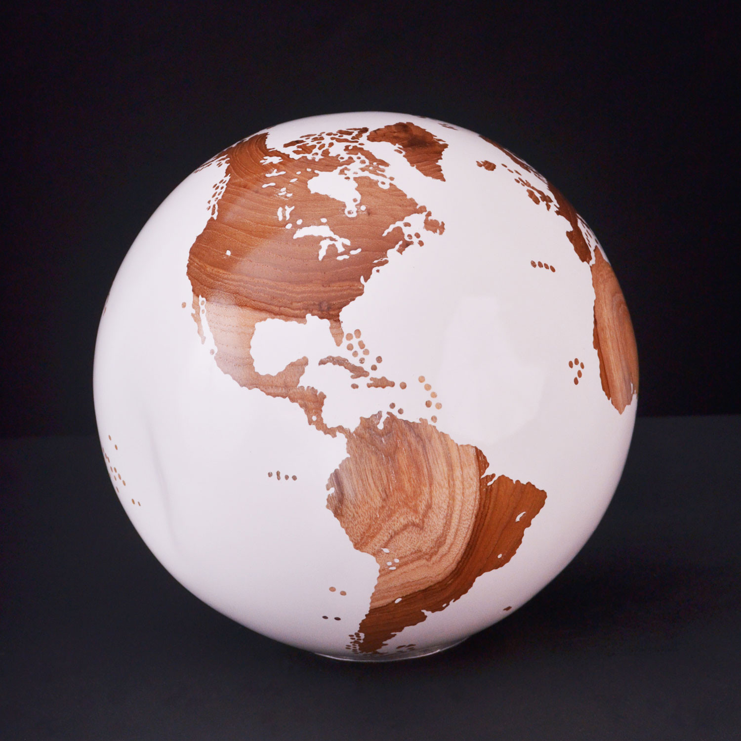The exclusive handcrafted globe was created with sustainable teak root. The finish features oceans in 150-layer smooth white acrylic resin and continents that have been fine-sanded smooth and clear coated, so you can appreciate the beautiful and distinctive natural grain of the teak root.