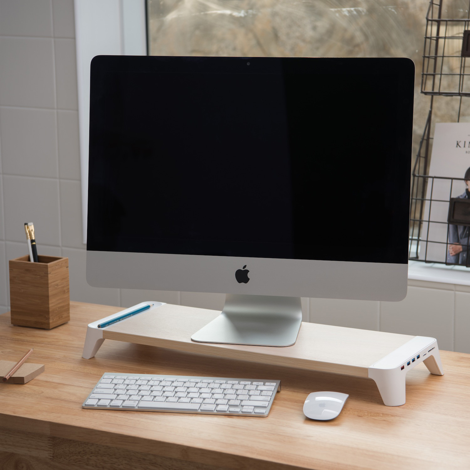 Woody is a comfortable desk accessory, simply and elegantly designed to help reduce neck and eye strain by raising monitor higher for more comfortable viewing. It features a super speed QC charger, USB 3.0 hubs, and an SD or Micro SD card reader. There's even a complementary ruler for measuring needs in the small tray on right hand side.