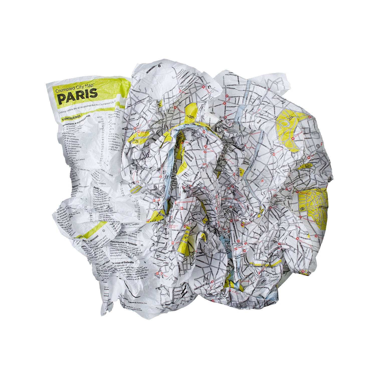 Unlike traditional paper maps which can be awkward to deal with, the Crumpled Cit Map can be easily crammed into your pocket, backpack, or the carrying pouch provided. Without having to worry about refolding it along the original creases , the map is printed on special technological material that makes them the lightest and most resistant maps on market. They are even 100% waterproof. Each map provides details about a large part of the city, including streets, monuments, museums, art galleries, and much more. Crumpled City maps include a sightseeing index and a list of unique "Soulsights."