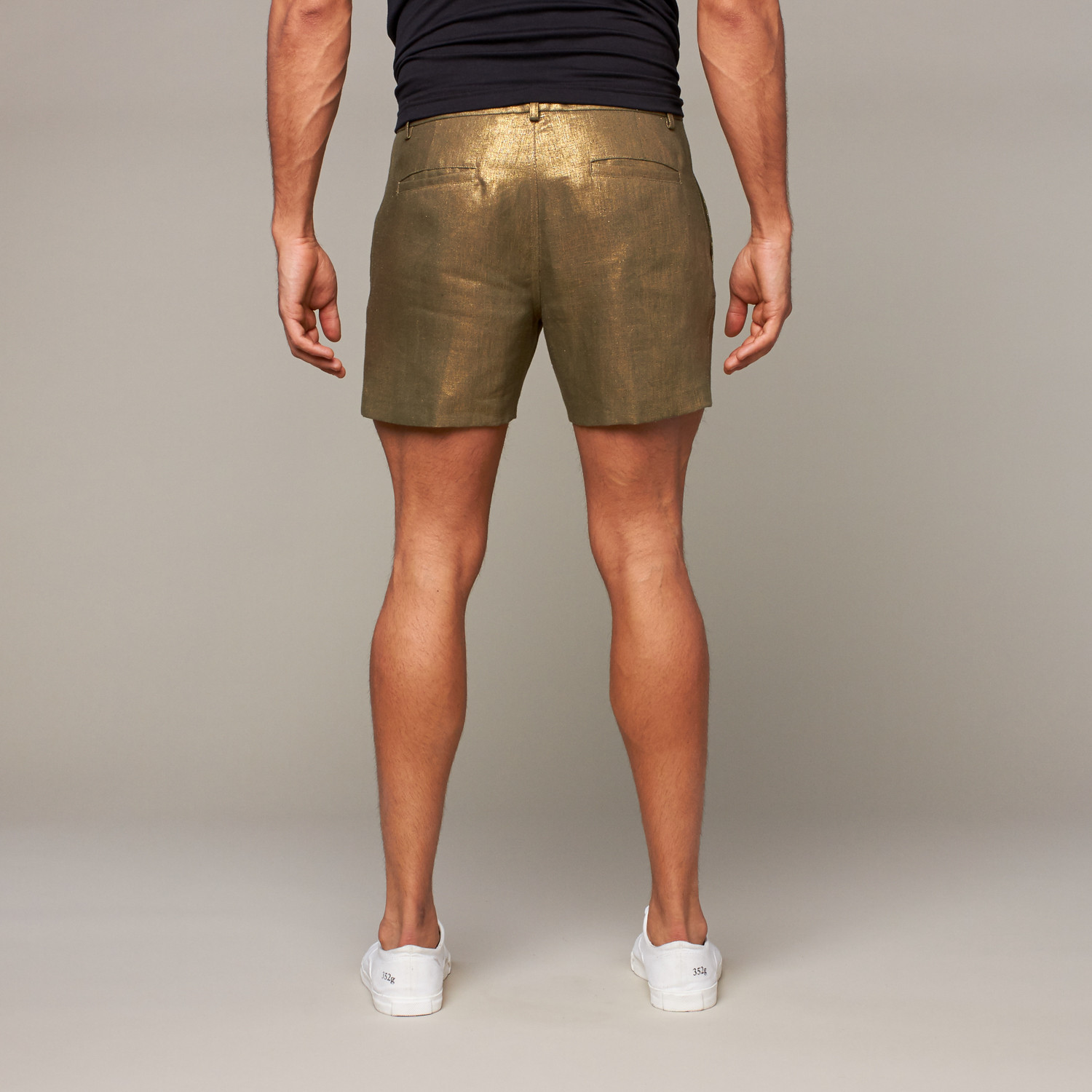 The Holler Short is a perfect resort essential that can take you from the beach to the street in supreme style. Done in an eye-popping, lustrous gold linen, details like angled welt waist pockets and custom-paired buttons make these short shorts a true knockout.