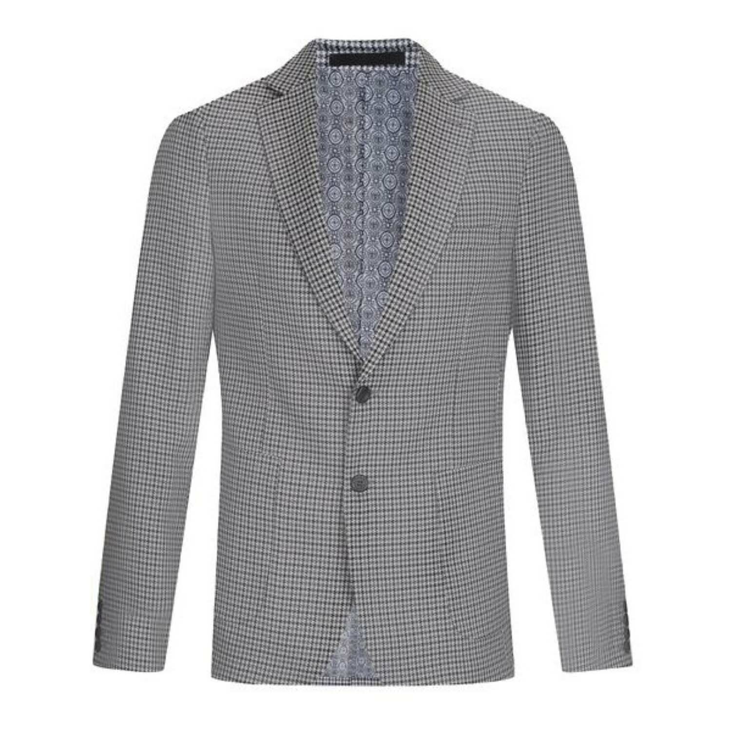 This plaid blazer features a clean two-button front, notch lapels, and practical flap pockets for a refined, modern silhouette. The subtly textured knit fabric adds depth while maintaining a polished appearance, and a patterned interior lining enhances the overall finish. A versatile piece ideal for smart casual styling or elevated everyday wear.