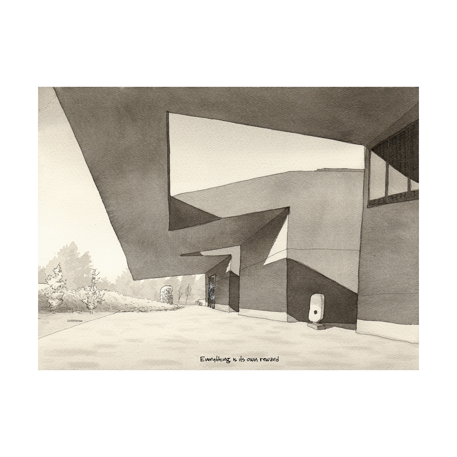 Everything Is It's Own Reward is a gorgeous print taken straight from Paul Madonna's illustrious archives. This thoughtful piece is a rendering of a museum courtyard with a distinctly geometrical architecture.