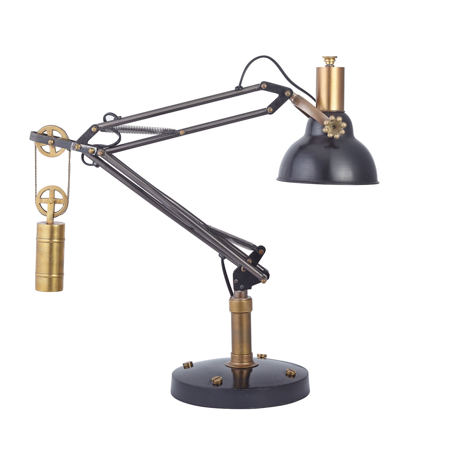 An homage to the engineering spirit of the Industrial Age, the Manchester Table Lamp creates stunning illumination in a union of black steel and solid machined brass. Featuring exposed steel tension springs and a solid brass counterweight with pulley mechanism, this working light is a true mechanical marvel.