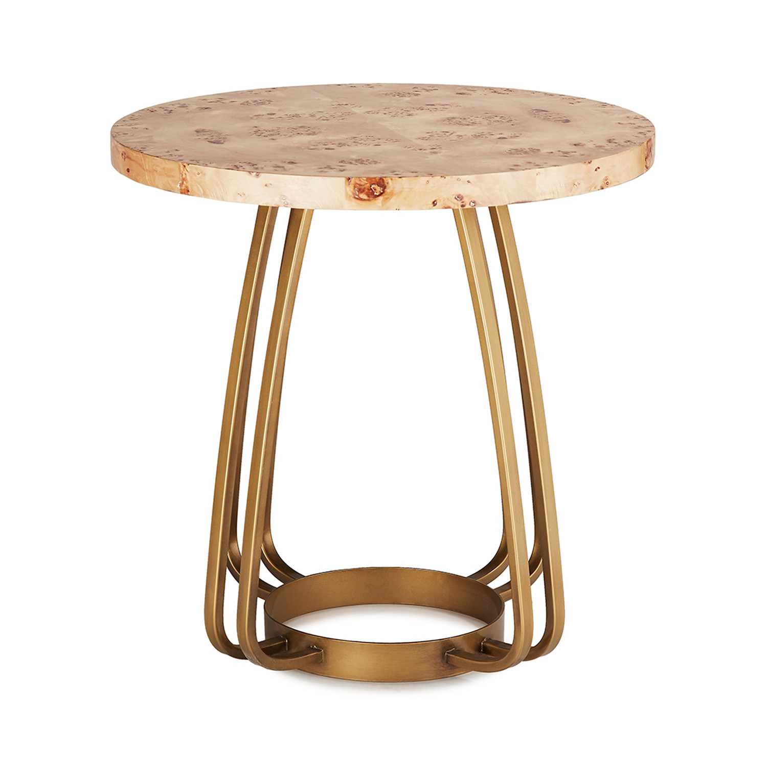 Soft, fluid lines add grace to the contemporary Kaymer Accent Table. The base is made of iron with a bronze-toned finish, while the table's top has a painted surface reminiscent of cork or natural tree bark.