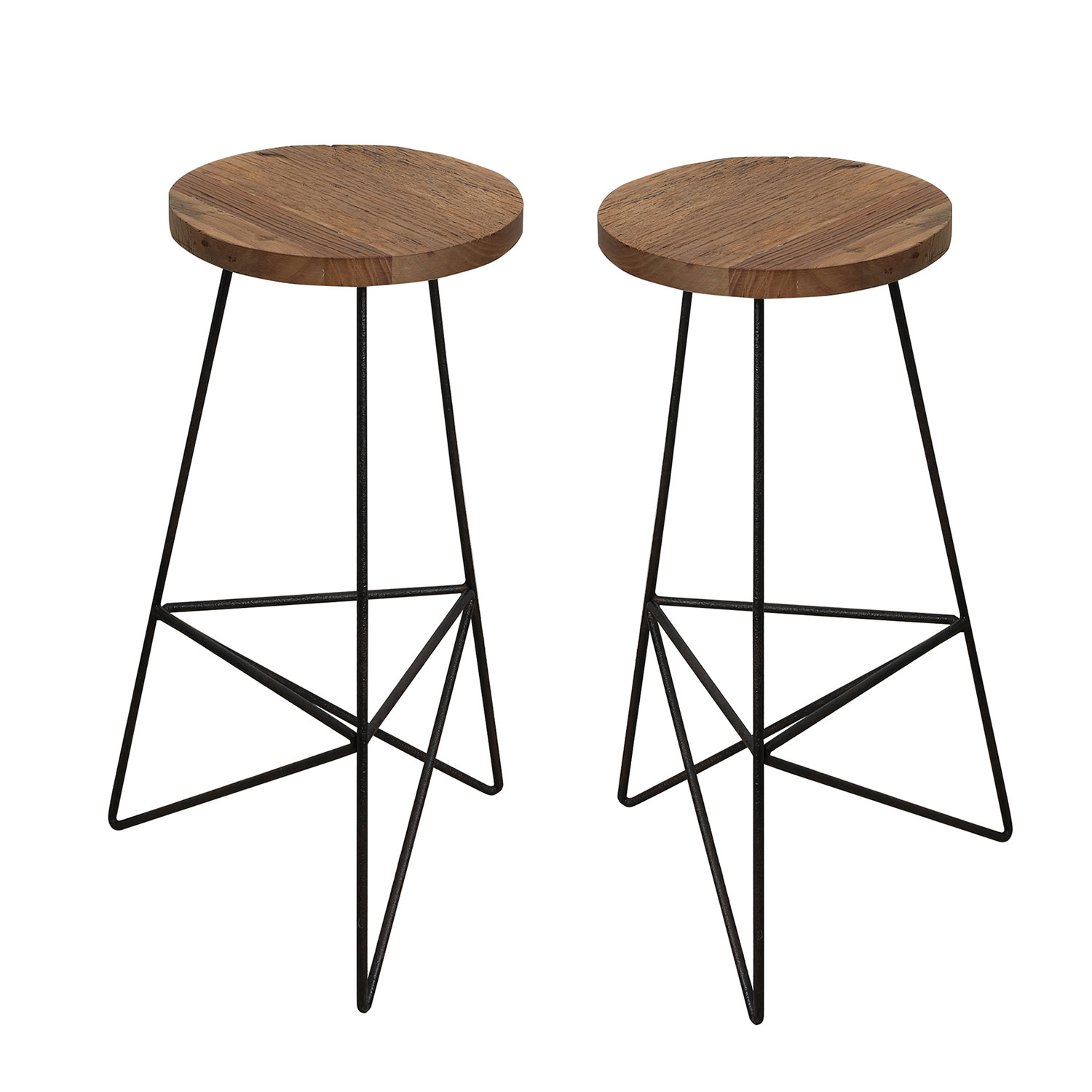 A fusion of modern lines and rustic warmth, the Ralph Bar Set is at home in a variety of home décor styles. The solid iron legs are sculpted into geometric lines that intrigue the eye while the tops of the stools use reclaimed elm that shows its own unique pattern crafted by age.