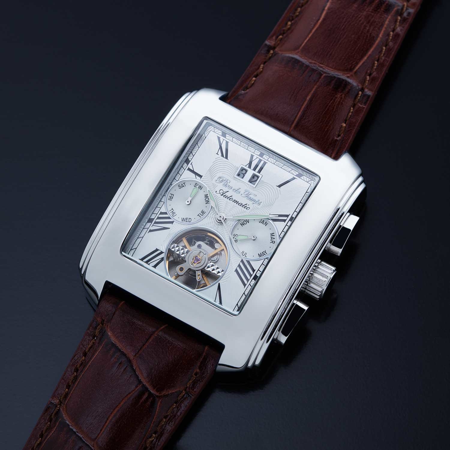 Crafted in a timeless tank style, with European lines and bold look, the Patton encourages the wearer to lead the way. With a 35-jewel automatic mechanical movement and an exhibition dial at 6 o'clock, it's for the individual who knows what he wants, how he wants it, and is not afraid to get it.