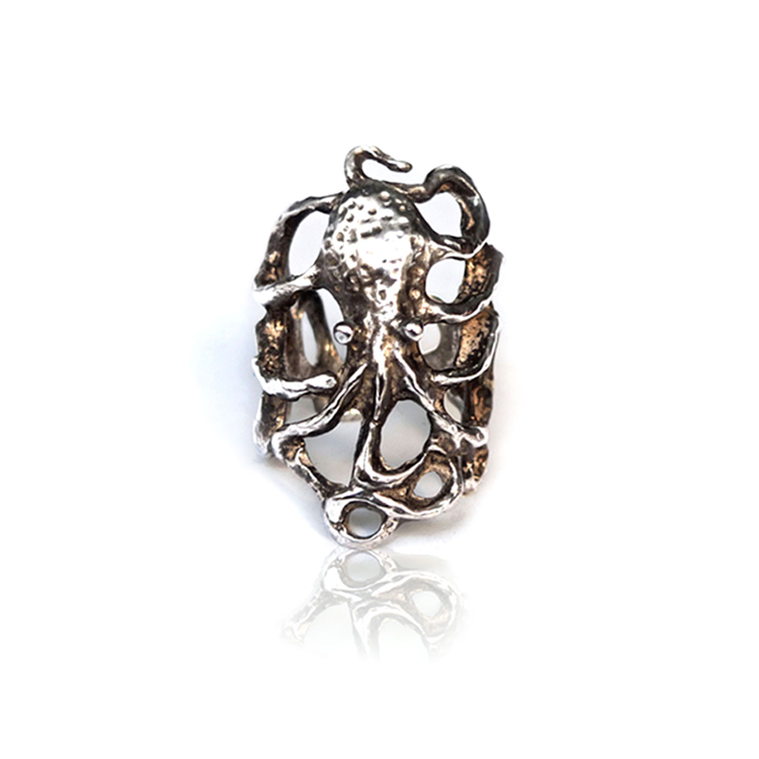 This Octopus Ring is the perfect pick for those who love precious metals, beautiful creatures, and an organic feel. Inspired by the captivating cephalopod, this piece is hand-built and cast in Brooklyn, a handsome addition to any outfit.