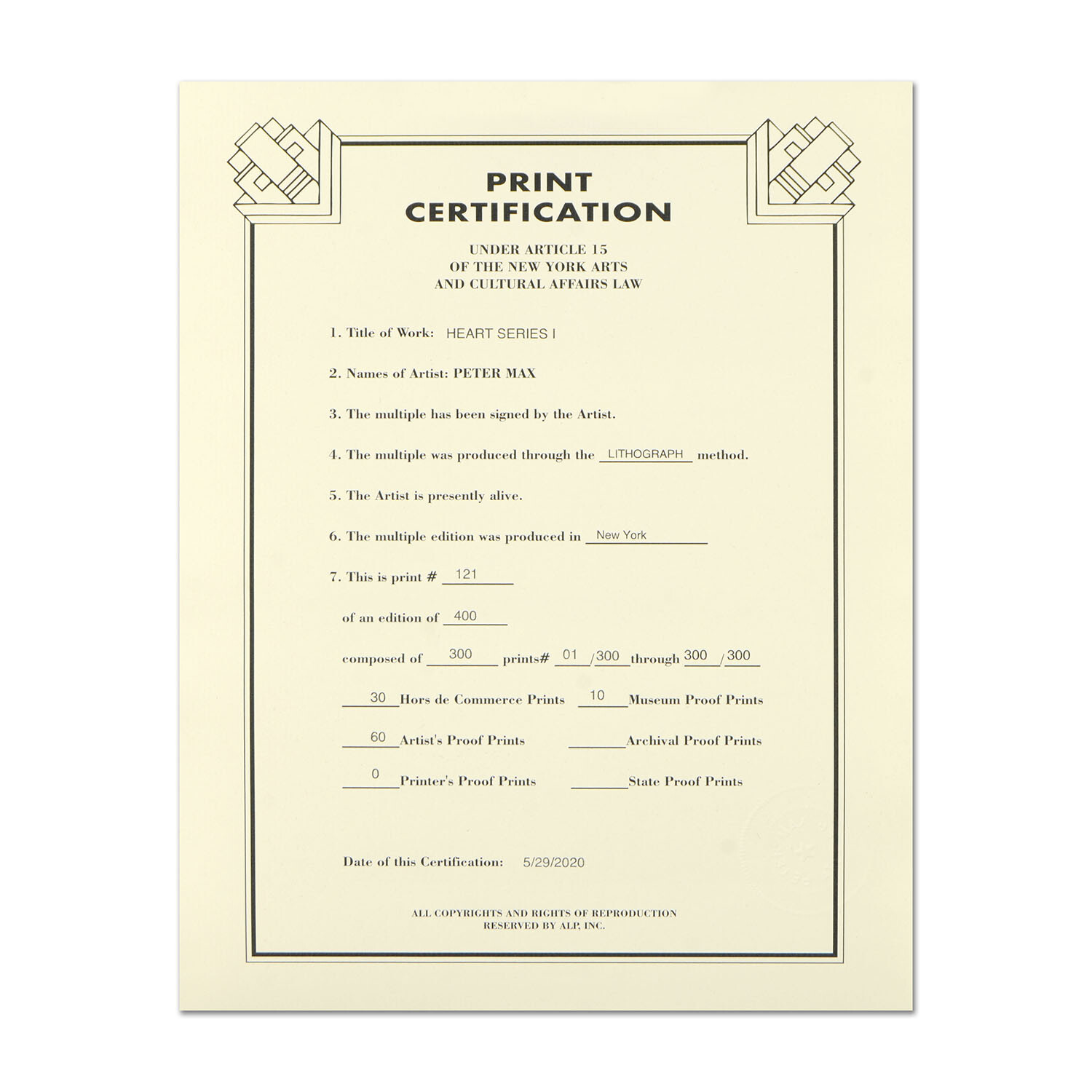 Peter Max is a German-American artist known for his bold, bright works of art. He is most commonly associated with the visual arts and culture of the 1960s, particularly psychedelic and pop art. A combination of Expressionism and Pop Art, Max's work is often dedicated to the country he loves, with the Statue of Liberty and the American flag often being prominent in his painting. This collection of signed artwork highlights Max's longtime success.