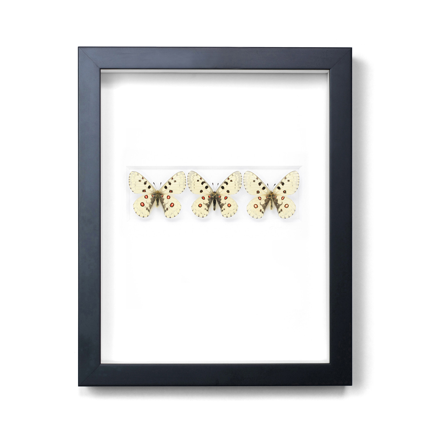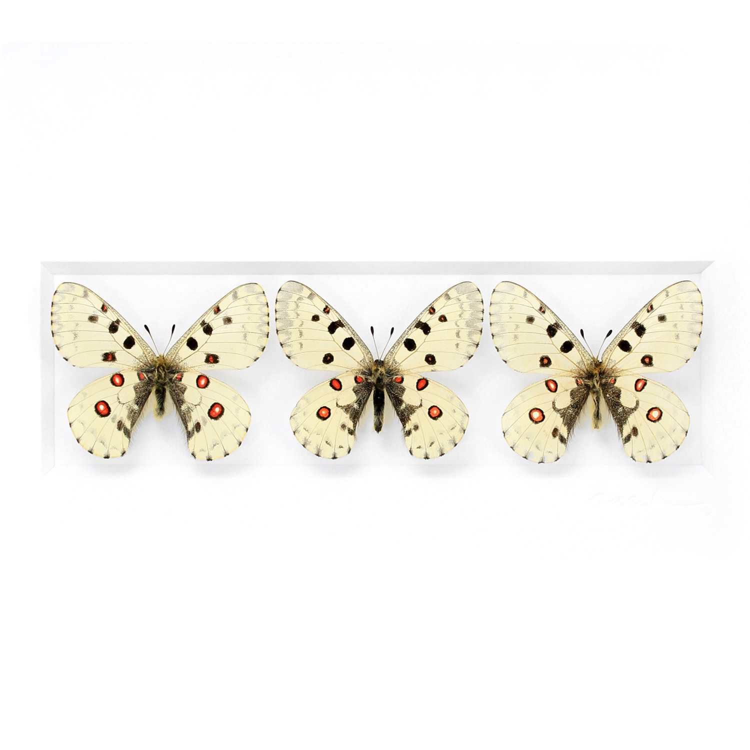 The Parnassius or "Apollo" Butterflies are a unique genus in several ways. Their tremendously vast, high altitude range stretches from the Alps in Europe to the Himalayas and beyond to Eastern China. They also show a remarkable range of markings always within a limited palette of white, charcoal and red.