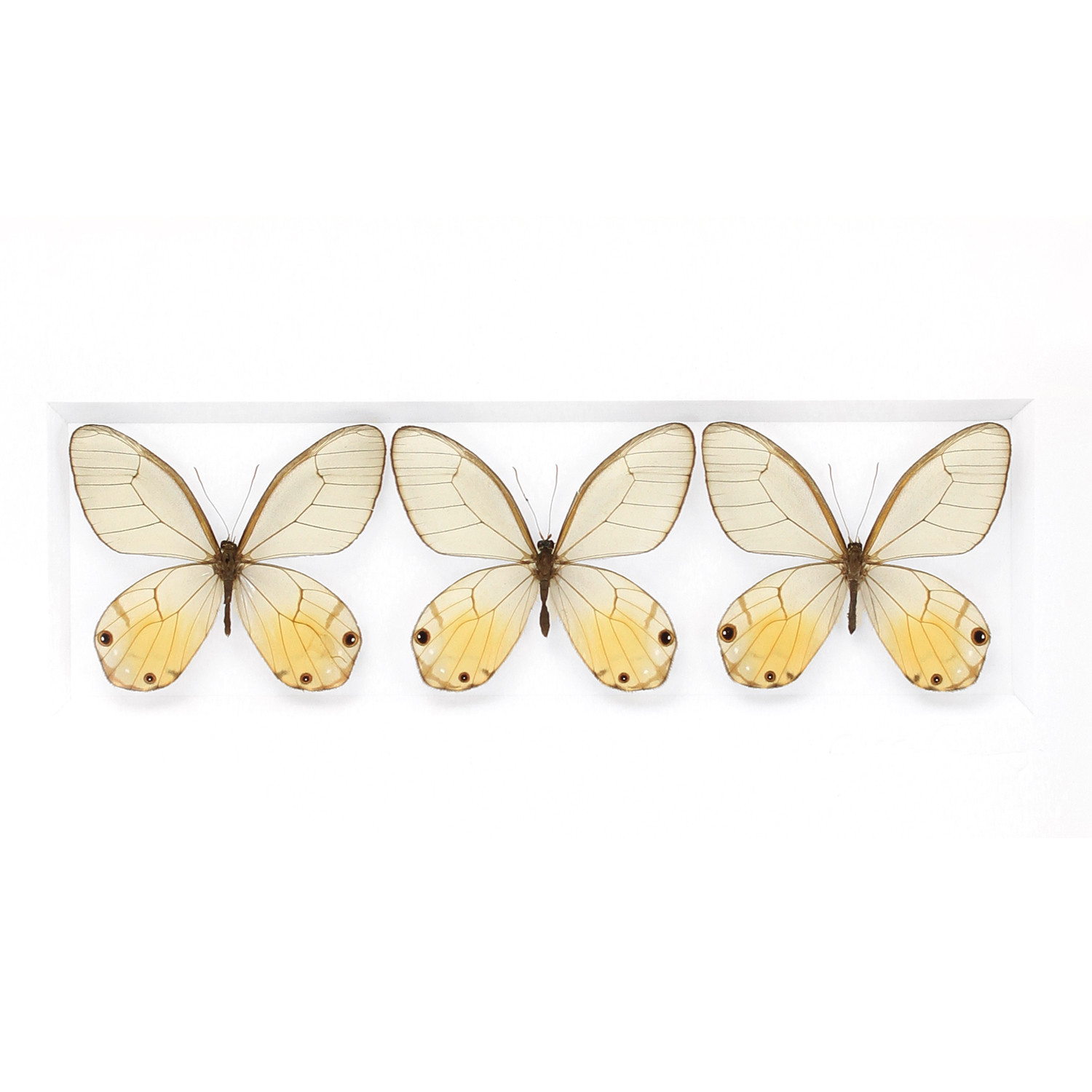 The Clearwing butterflies hail from an otherwise dull family of small butterflies called “browns.” They are utterly unique creatures as their wings are almost entirely transparent, except for the marked veins and a light flush of color on the hindwings. The shadow that is cast by the veins and markings of the wings is visible through the translucent scales resulting in an unusually three-dimensional effect on white.
