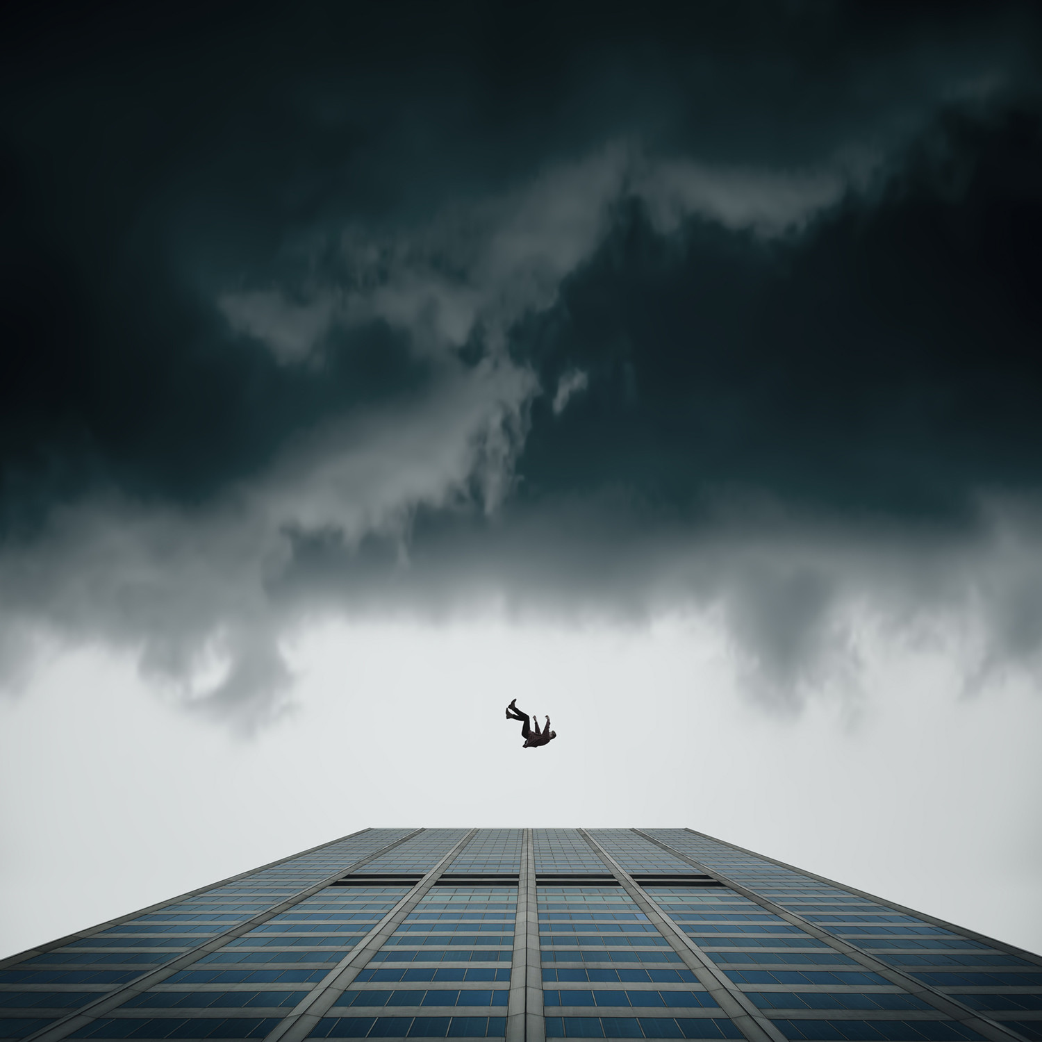 This Life of Mine by Phil McKay depicts a tragic scene where businessman in his suit is falling from a skyscraper, set against dark tumultuous clouds. This gloomy artwork appears to tell a story on the trappings of post-modern work life and its adverse effects.