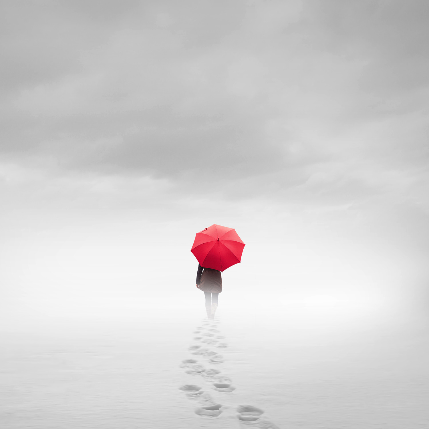 Walking in Winter by Phil McKay portrays a dreamy winter landscape without a horizon line. The figure depicted in colors is walking into the snow scene as her foot prints in the snowy foreground lead the viewers into the painting. Her bright red umbrella creates a focal point against the white and light grey landscape.