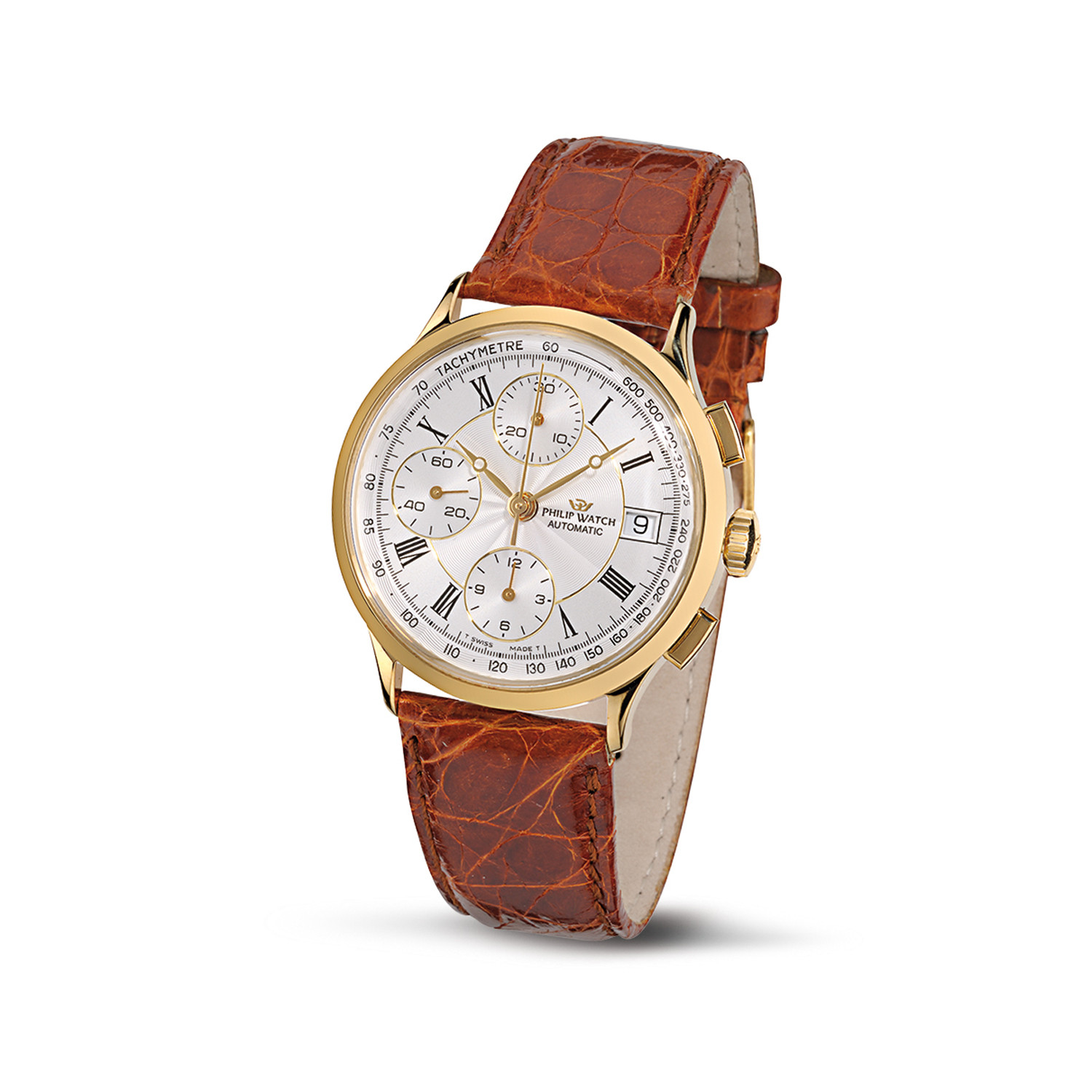 Made with extreme care, the Gold Story Chrono is a gold and brown beauty, with luxurious details everywhere you dare to look. Its strap is brown crocodile leather, and its Swiss-made structure is packed with far-out functions and an automatic movement.