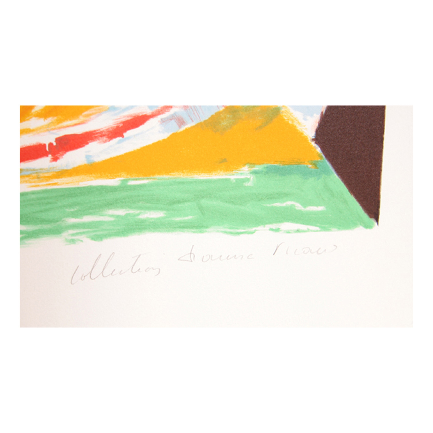 This Pablo Picasso limited edition lithograph portrait features a woman in a striking cubist style with a hat. The original painting this print was created from, Femme Accoudee au Drapeau Bleu et Rouge, was painted in 1932. This piece of artwork is from the Marina Picasso estate collection, with Marina being the granddaughter of the great cubist modern master. These lithographs were produced from 1979-1982 under the direction of the chromist Laurent Marcel Salinas. From a limited edition of 500 lithographs, this piece has been signed and numbered by the "Collection Marina Picasso," with a blindstomp and ink stamp on verso that reads 'Approved by the heirs of Pablo Picasso.'