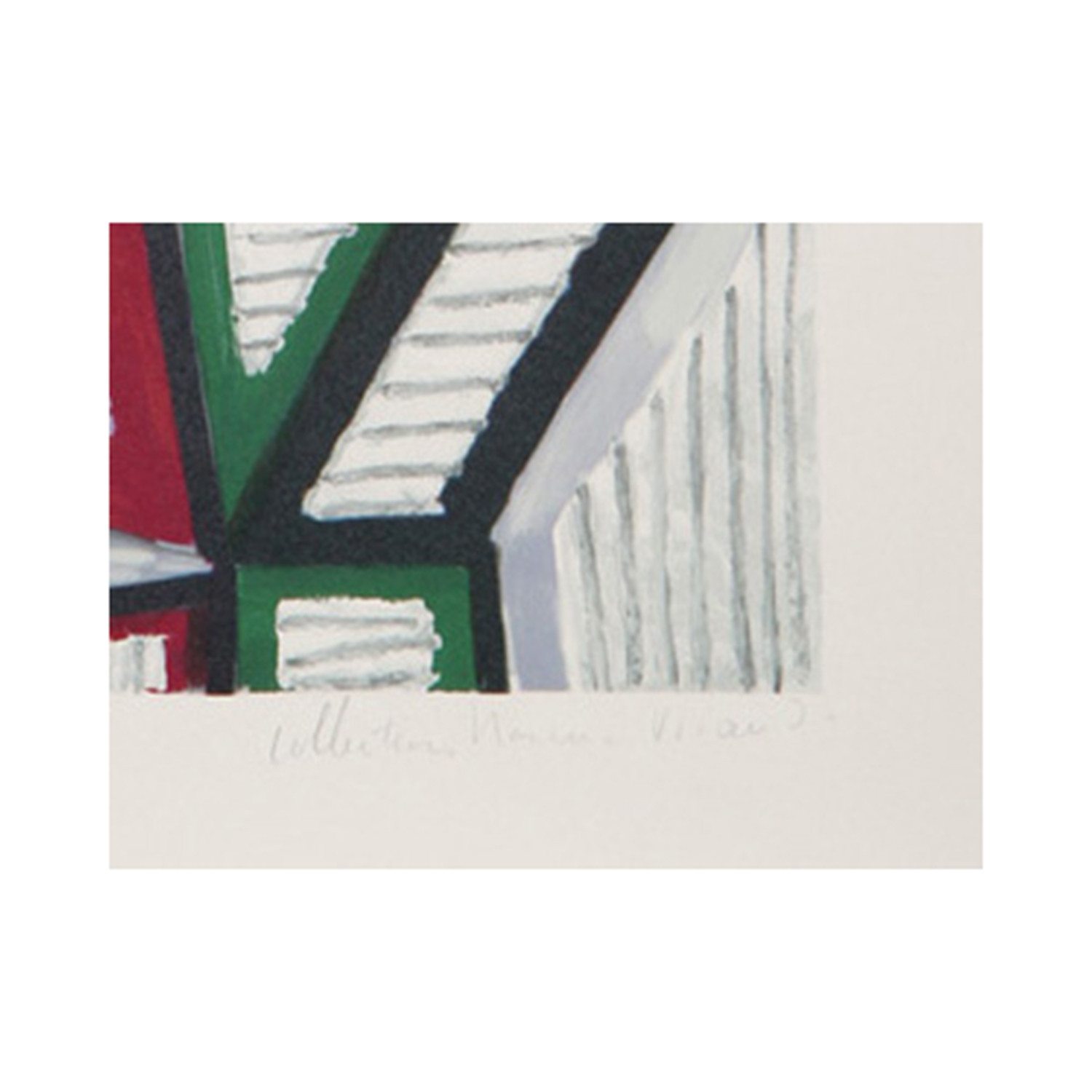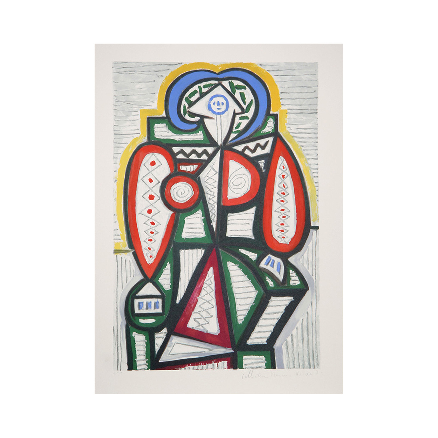 This Pablo Picasso limited edition lithograph portrait is of a seated woman in bold primary colors and lines. This painting from which this lithograph was created, Femme Assise, was painted in 1947. This piece of artwork is from the Marina Picasso estate collection, with Marina being the granddaughter of the great cubist modern master. These lithographs were produced from 1979-1982 under the direction of the chromist Laurent Marcel Salinas. From a limited edition of 500 lithographs, this piece has been signed and numbered by the "Collection Marina Picasso," with a blindstomp and ink stamp on verso that reads 'Approved by the heirs of Pablo Picasso.'