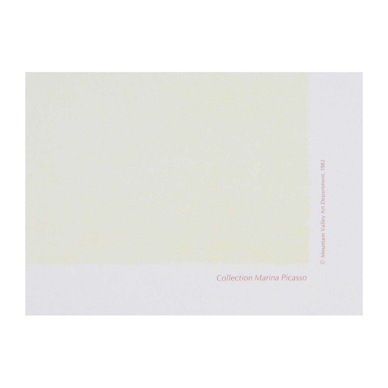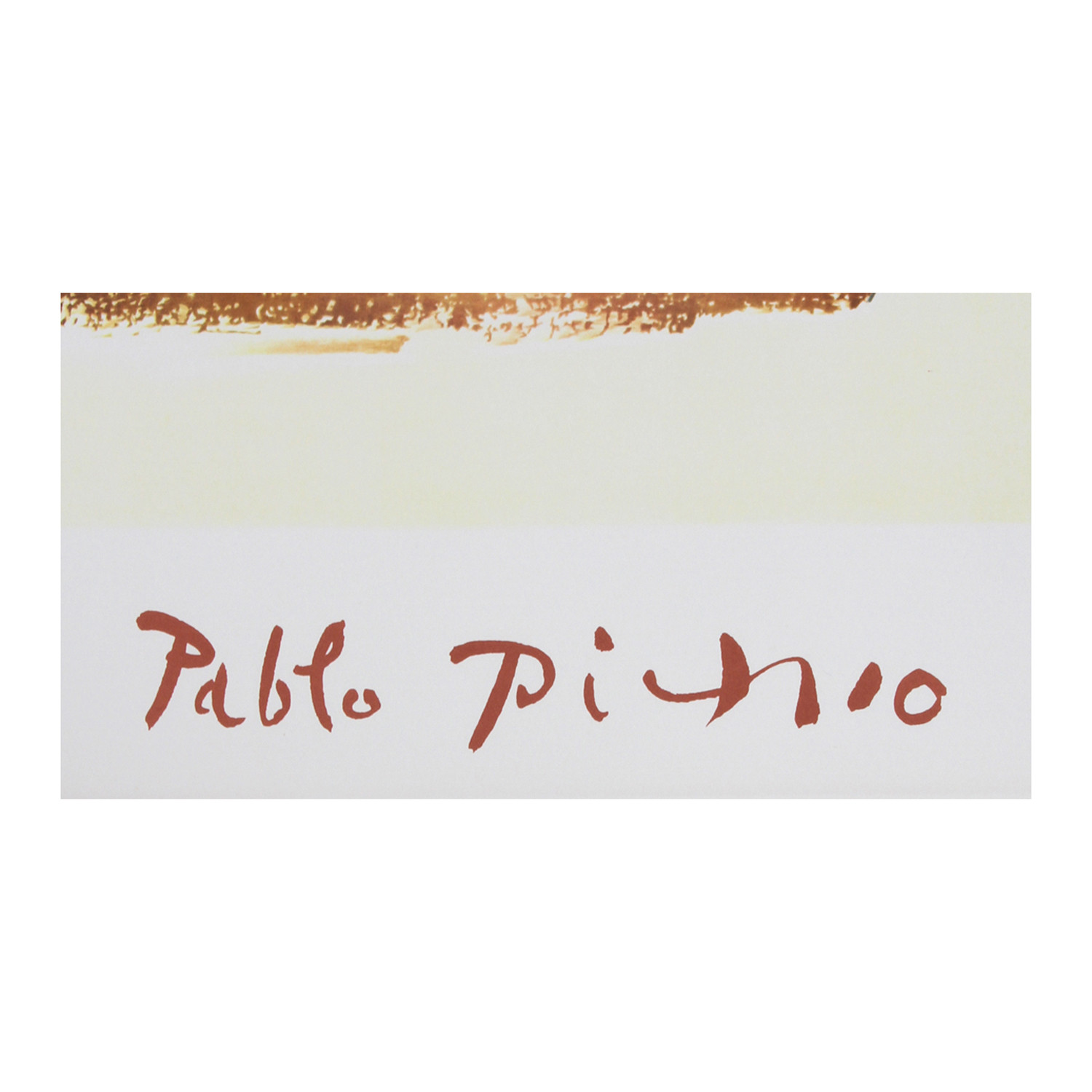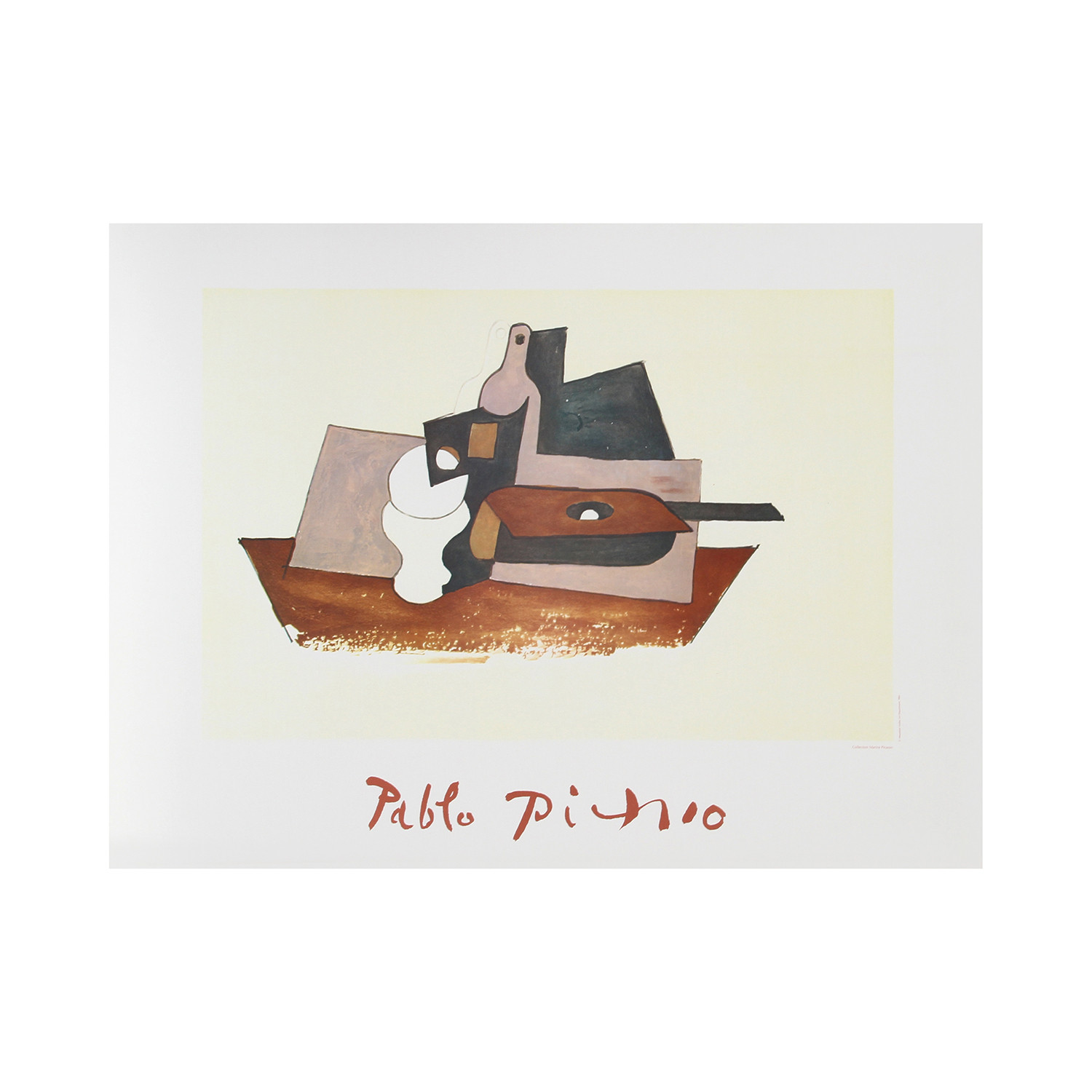 This Pablo Picasso limited edition lithograph poster depicts a still life in an abstract cubist style of a guitar and a bottle. The original painting this print was created from, Guitare Verre et Bouteille, was painted in 1919. This piece of artwork is from the Marina Picasso estate collection, with Marina being the granddaughter of the great cubist modern master. These lithographs were produced from 1979-1982 under the direction of the chromist Laurent Marcel Salinas. This particular piece is from a limited edition of 1000 printed with an estate-approved signature below the artwork.