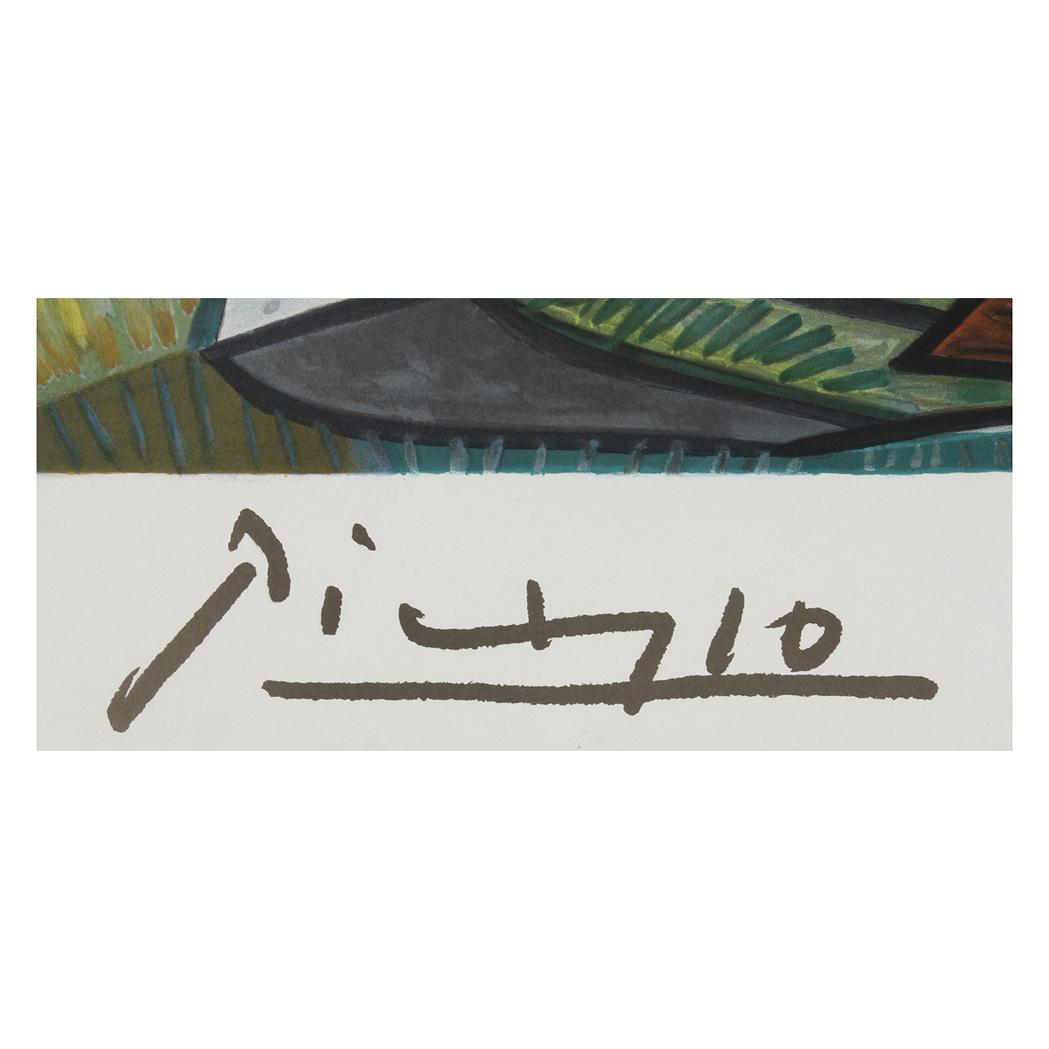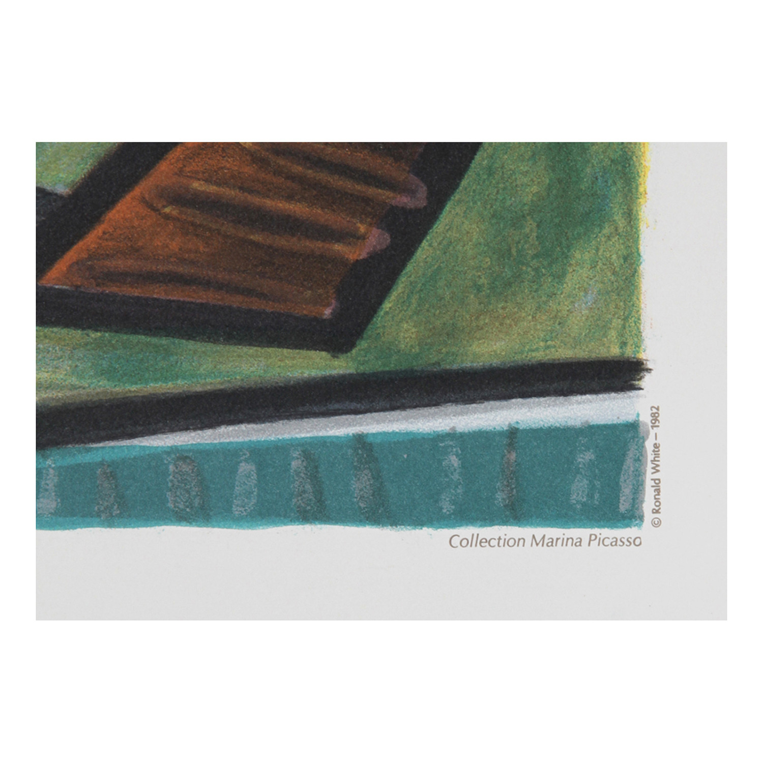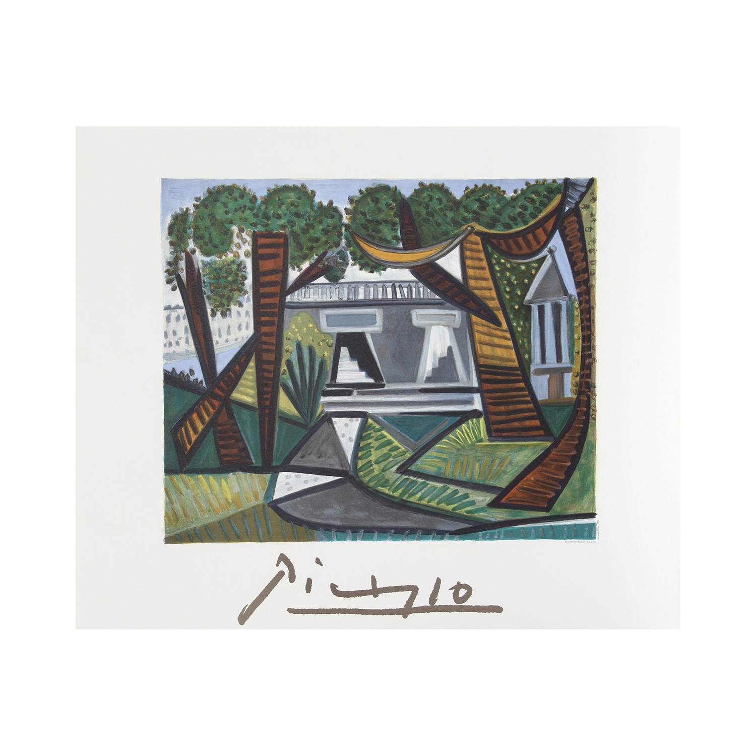 This Pablo Picasso limited edition lithograph poster depicts a house with columns and trees surrounding in a modern cubist style. The original painting this print was created from, Le Verte Galant was painted in 1943. This piece of artwork is from the Marina Picasso estate collection, with Marina being the granddaughter of the great cubist modern master. These lithographs were produced from 1979-1982 under the direction of the chromist Laurent Marcel Salinas. This particular piece is from a limited edition of 1000 printed with an estate-approved signature below the artwork.
