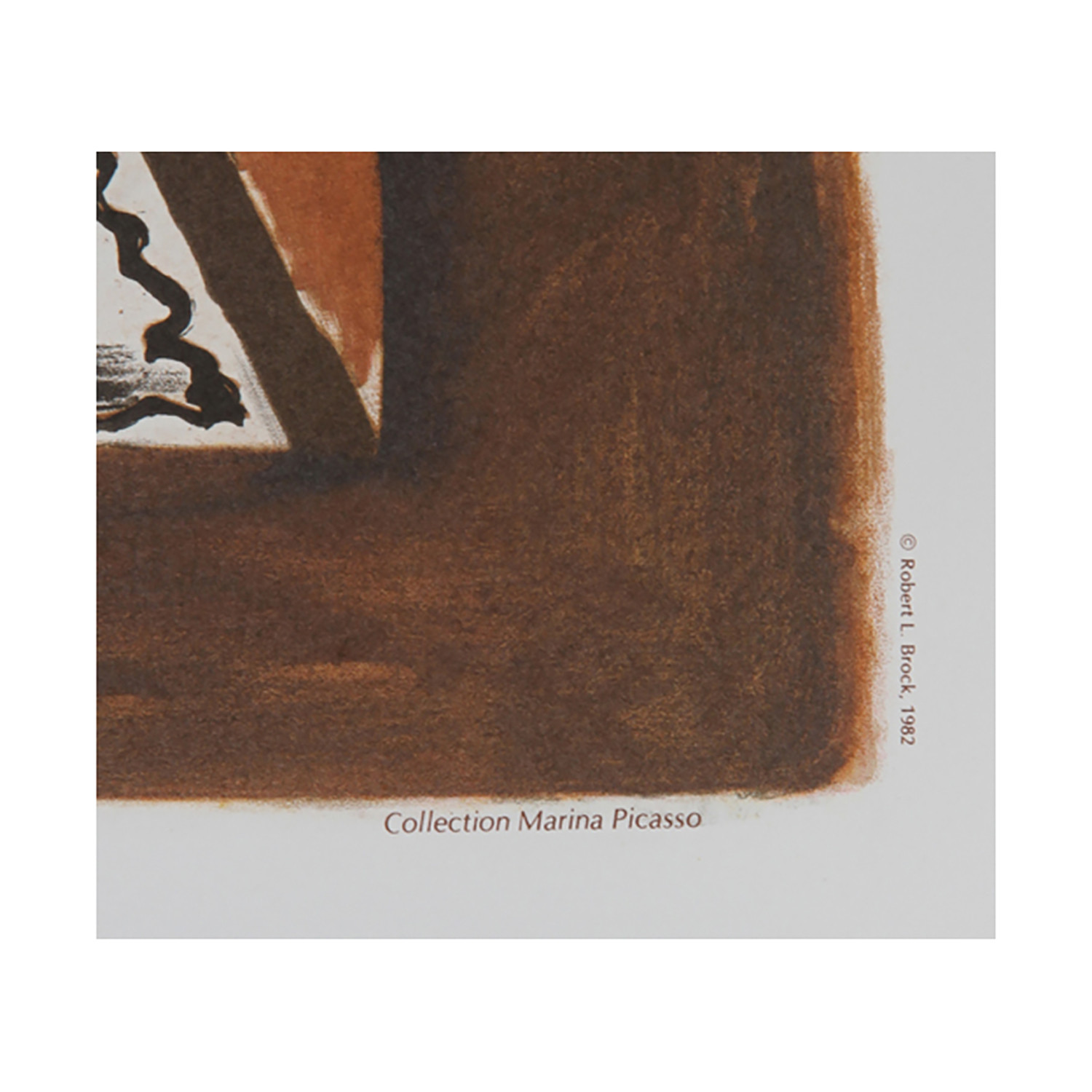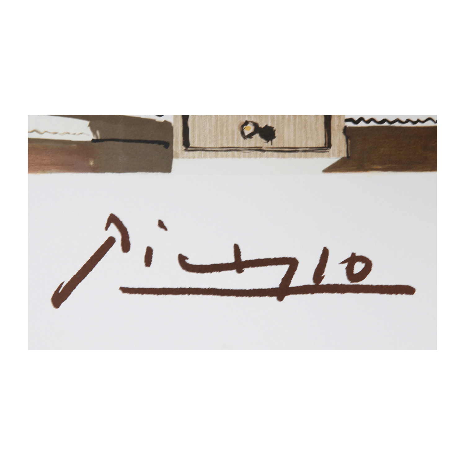 This Pablo Picasso limited edition lithograph poster depicts a still life (Nature Morte) of flowers, fruit and a pitcher in a modern cubist style. The original painting this print was created from was painted in 1928. This piece of artwork is from the Marina Picasso estate collection, with Marina being the granddaughter of the great cubist modern master. These lithographs were produced from 1979-1982 under the direction of the chromist Laurent Marcel Salinas. This particular piece is from a limited edition of 1000 printed with an estate-approved signature below the artwork.