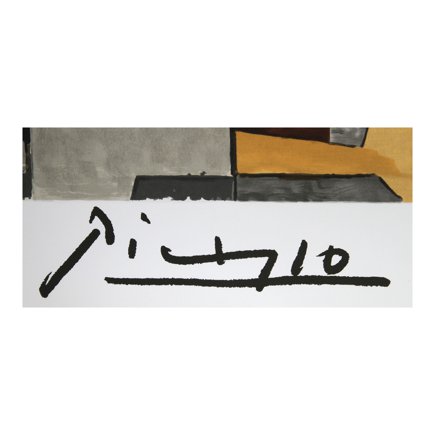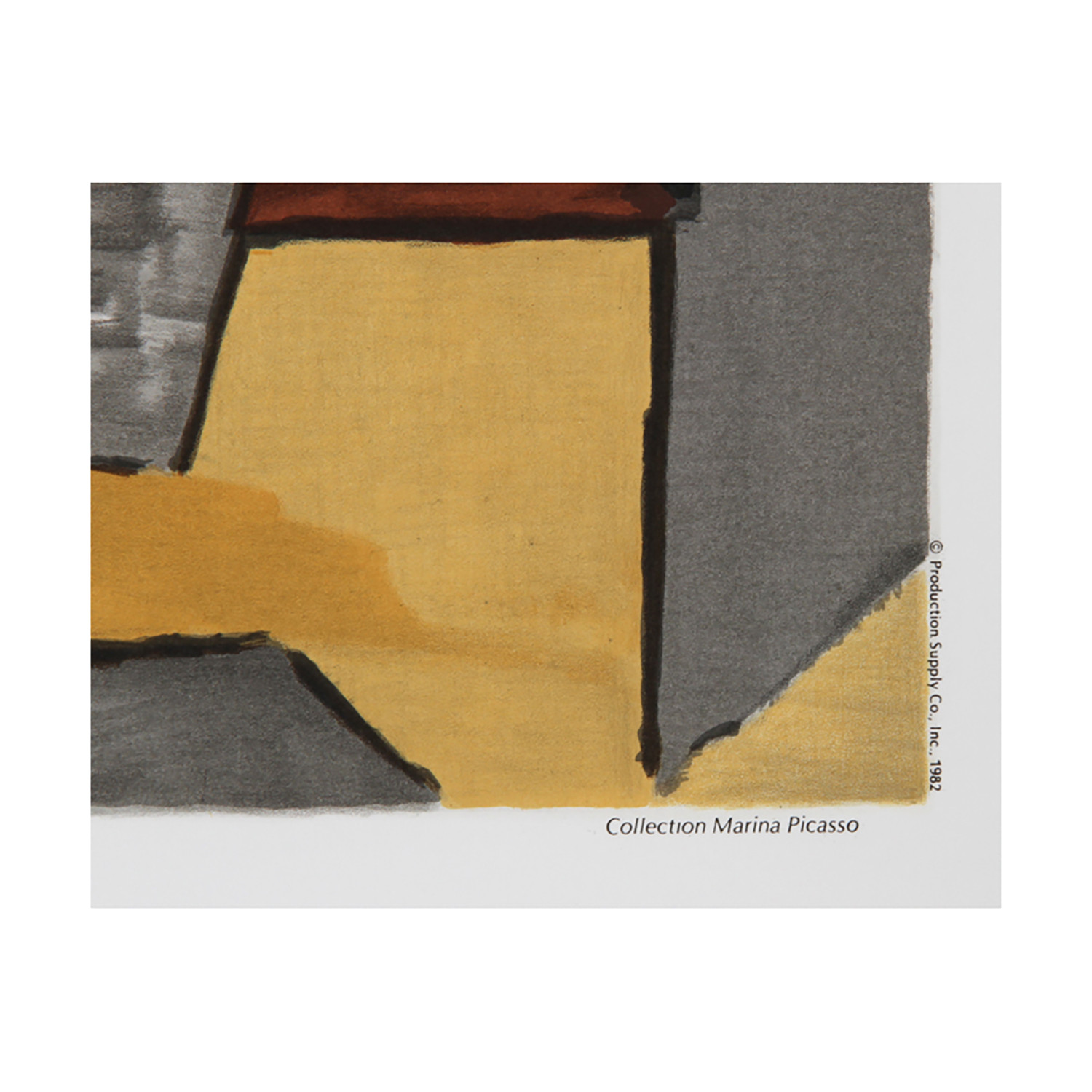This Pablo Picasso limited edition lithograph poster depicts a still life (nature morte) of a hutch with a bottle in cubist style in greys, dark reds and golden yellow. The original painting this print was created, Nature Morte a la Porte et a la Clef, from was painted in 1920. This piece of artwork is from the Marina Picasso estate collection, with Marina being the granddaughter of the great cubist modern master. These lithographs were produced from 1979-1982 under the direction of the chromist Laurent Marcel Salinas. This particular piece is from a limited edition of 1000 printed with an estate-approved signature below the artwork.