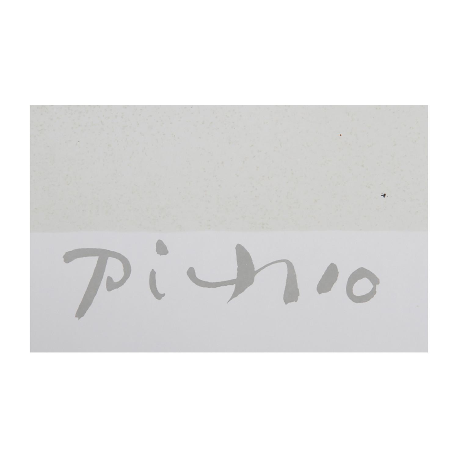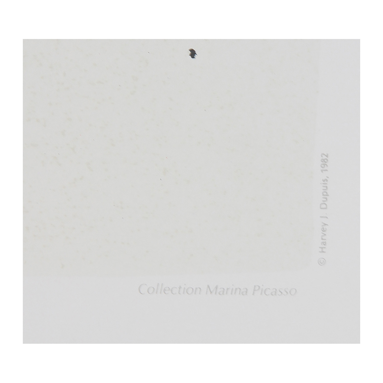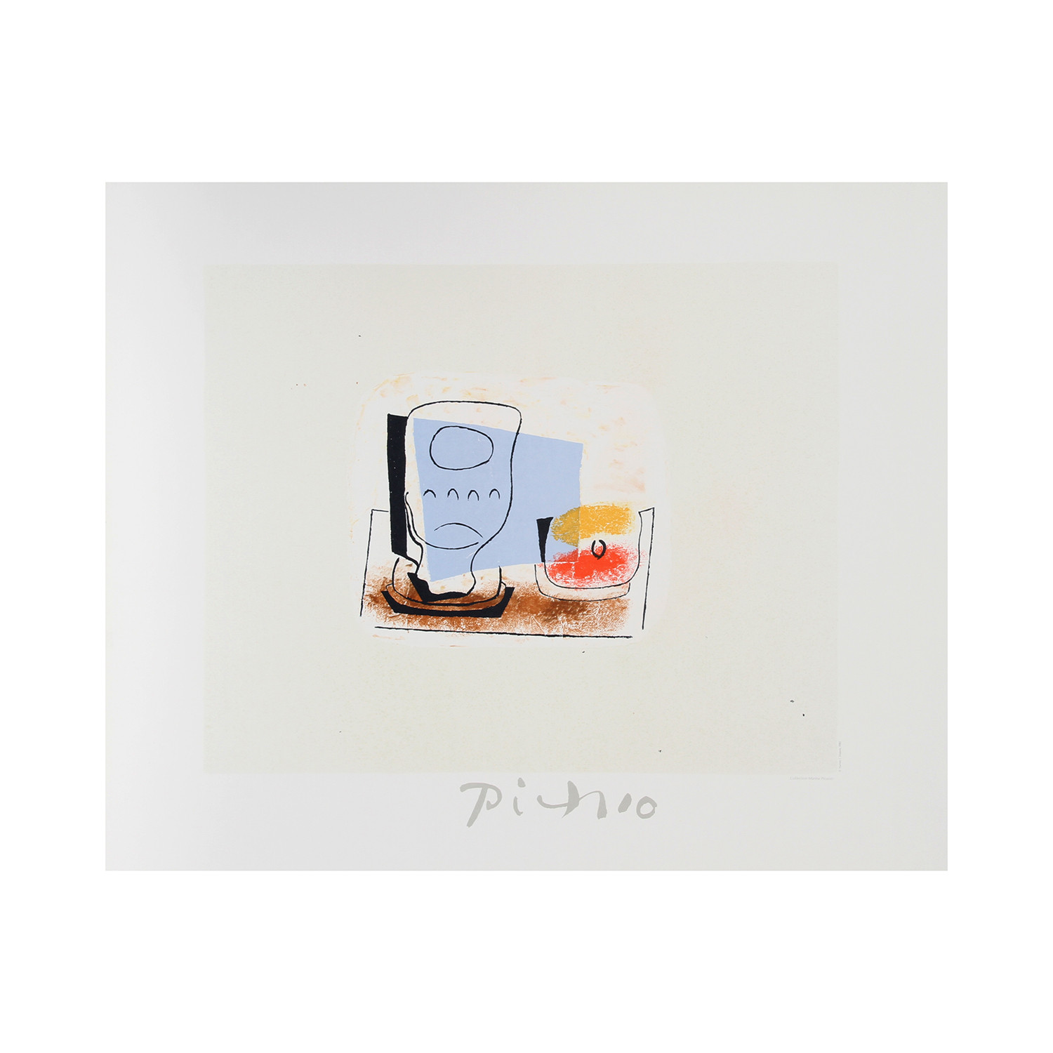 This Pablo Picasso limited edition lithograph poster depicts a minimalist still life (nature morte) of a glass and perhaps a piece of fruit in an abstract cubist style. The original painting this print was created from was painted in 1924. This piece of artwork is from the Marina Picasso estate collection, with Marina being the granddaughter of the great cubist modern master. These lithographs were produced from 1979-1982 under the direction of the chromist Laurent Marcel Salinas. This particular piece, Nature Morte au Verre, is from a limited edition of 1000 printed with an estate-approved signature below the artwork.