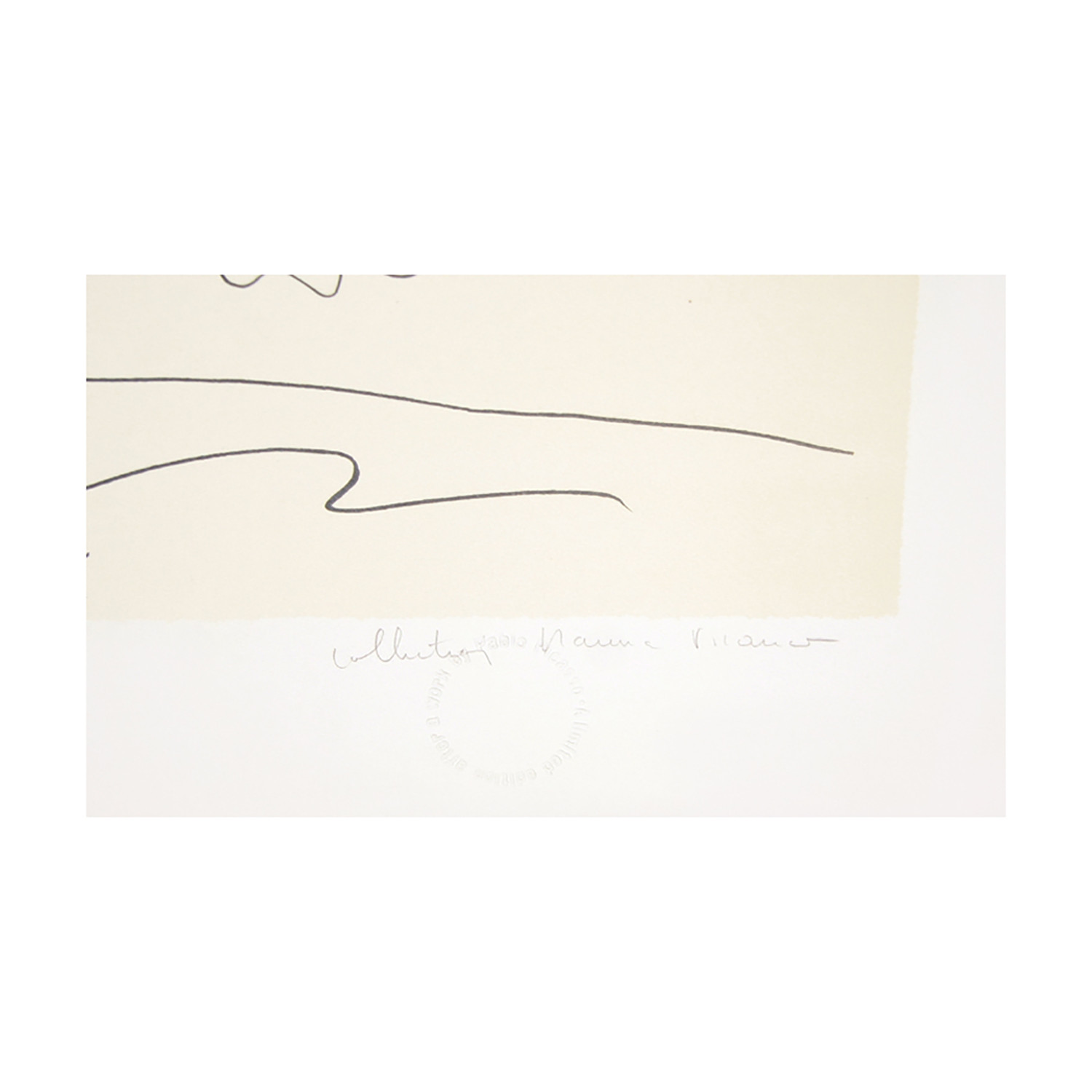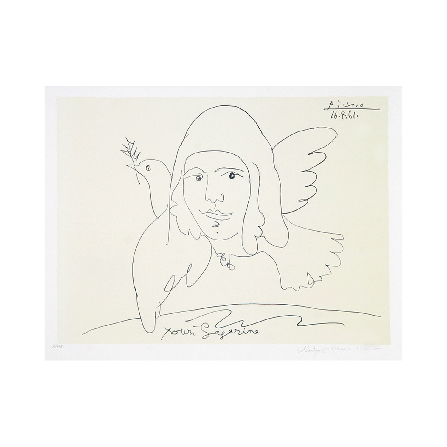 This Pablo Picasso limited edition lithograph is a portrait of Youri Gagarine, the first human to journey into space. Picasso depicted the cosmonaut with a dove of a peace. representing his mission between worlds. This piece of artwork is from the Marina Picasso estate collection, with Marina being the granddaughter of the great cubist modern master. These lithographs were produced from 1979-1982 under the direction of the chromist Laurent Marcel Salinas. From a limited edition of 500 lithographs, this piece has been signed and numbered by the "Collection Marina Picasso," with a blindstomp and ink stamp on verso that reads 'Approved by the heirs of Pablo Picasso.'