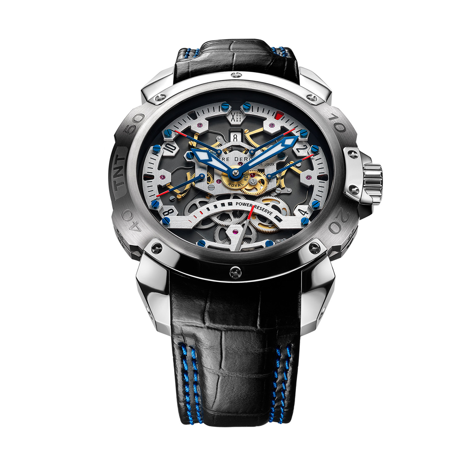 Dial-less but not without character, the TNT Royal reveals all the virtuosity of the “vallée de joux“ watchmakers, as well as the passionate personality of a couple with their own distinctive characters. Bridges, gear-trains and rotors form the power centre of these watches with their nerves of steel.