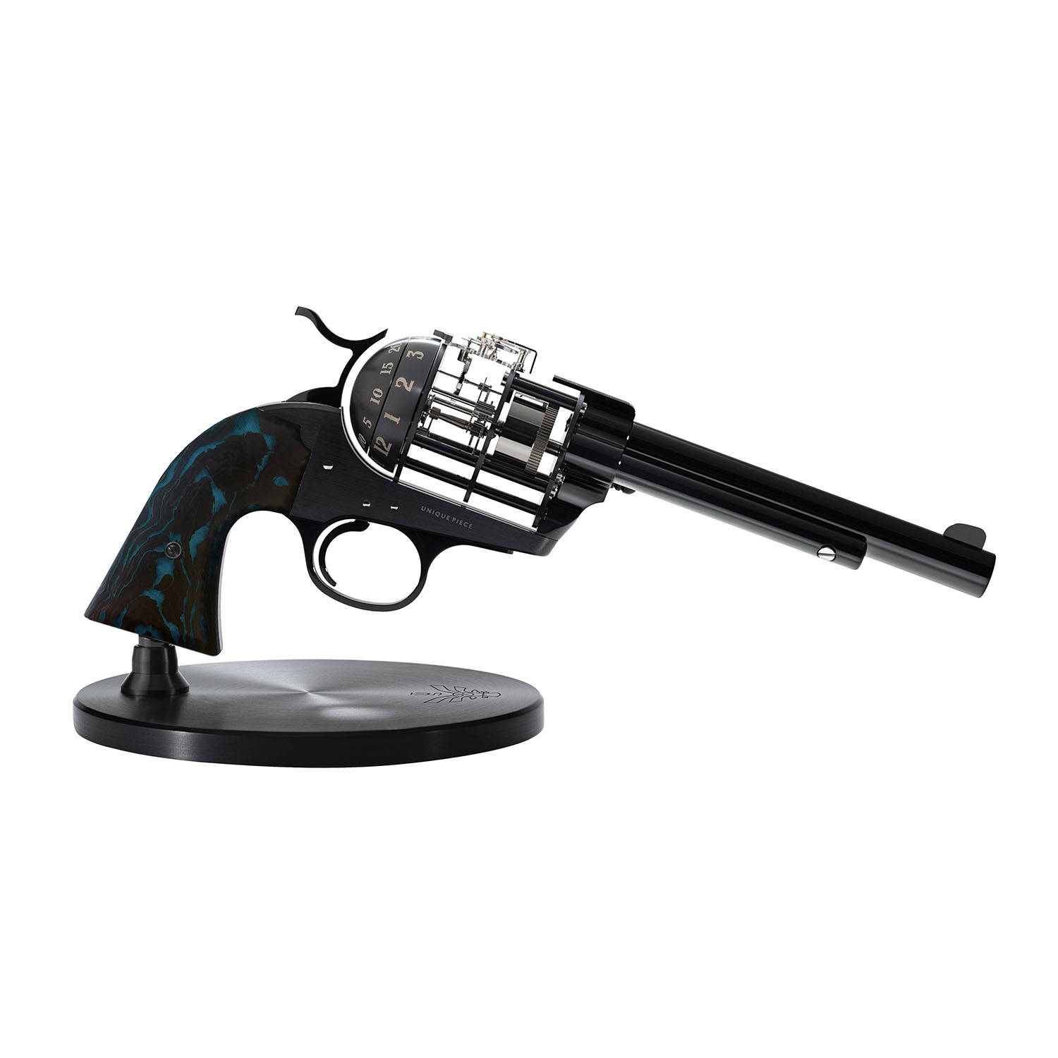 Founded in 2019 in Switzerland, the Unnamed Society is a team of designers and inventors committed to creating coveted pieces for the most exclusive clients. Their first collection is developed in collaboration with L'EPEE, and reinterprets the concept of a timekeeper from a radical perspective. The Bang Revolver Clock is an intricate work of art and precision that engages the imagination and senses on a variety of levels.