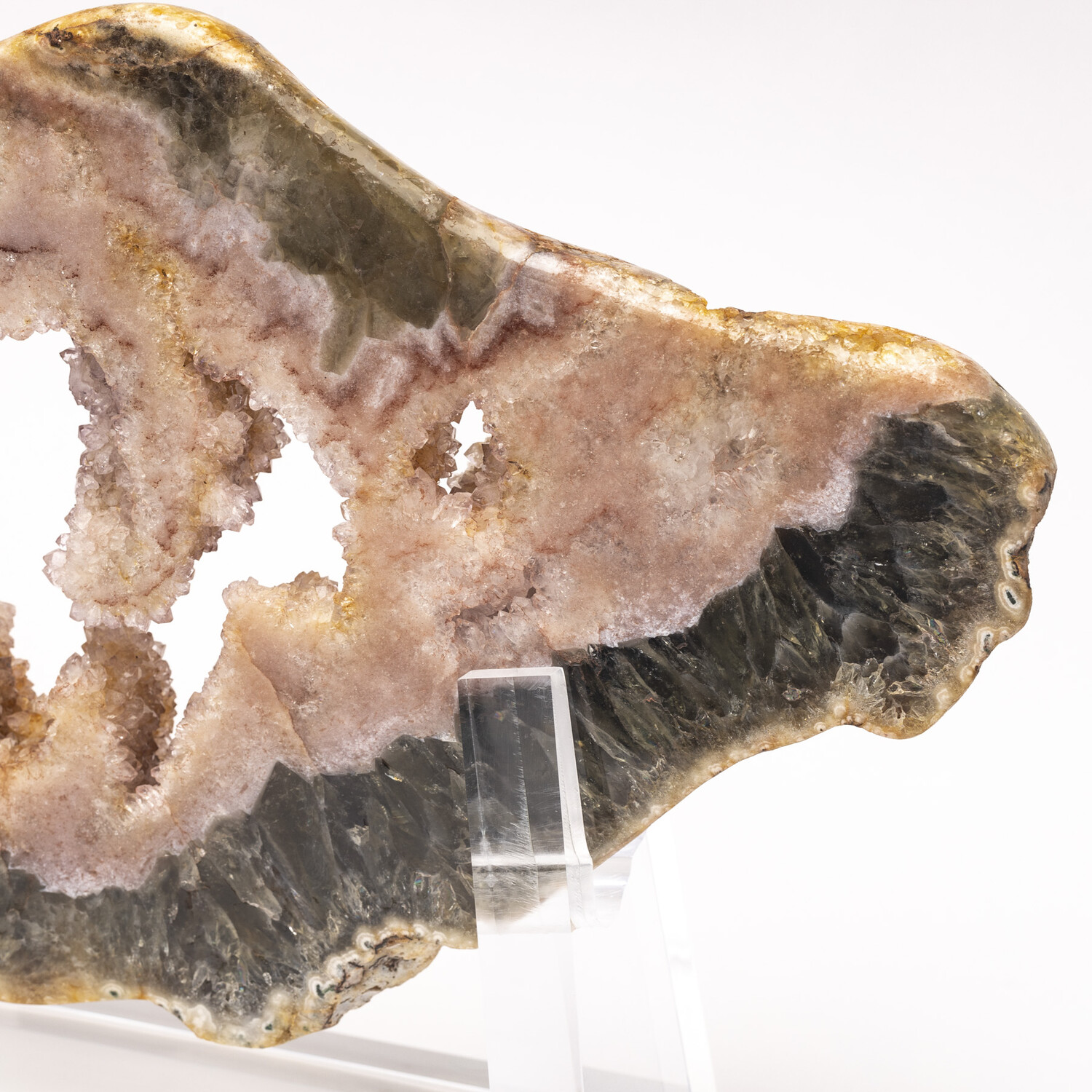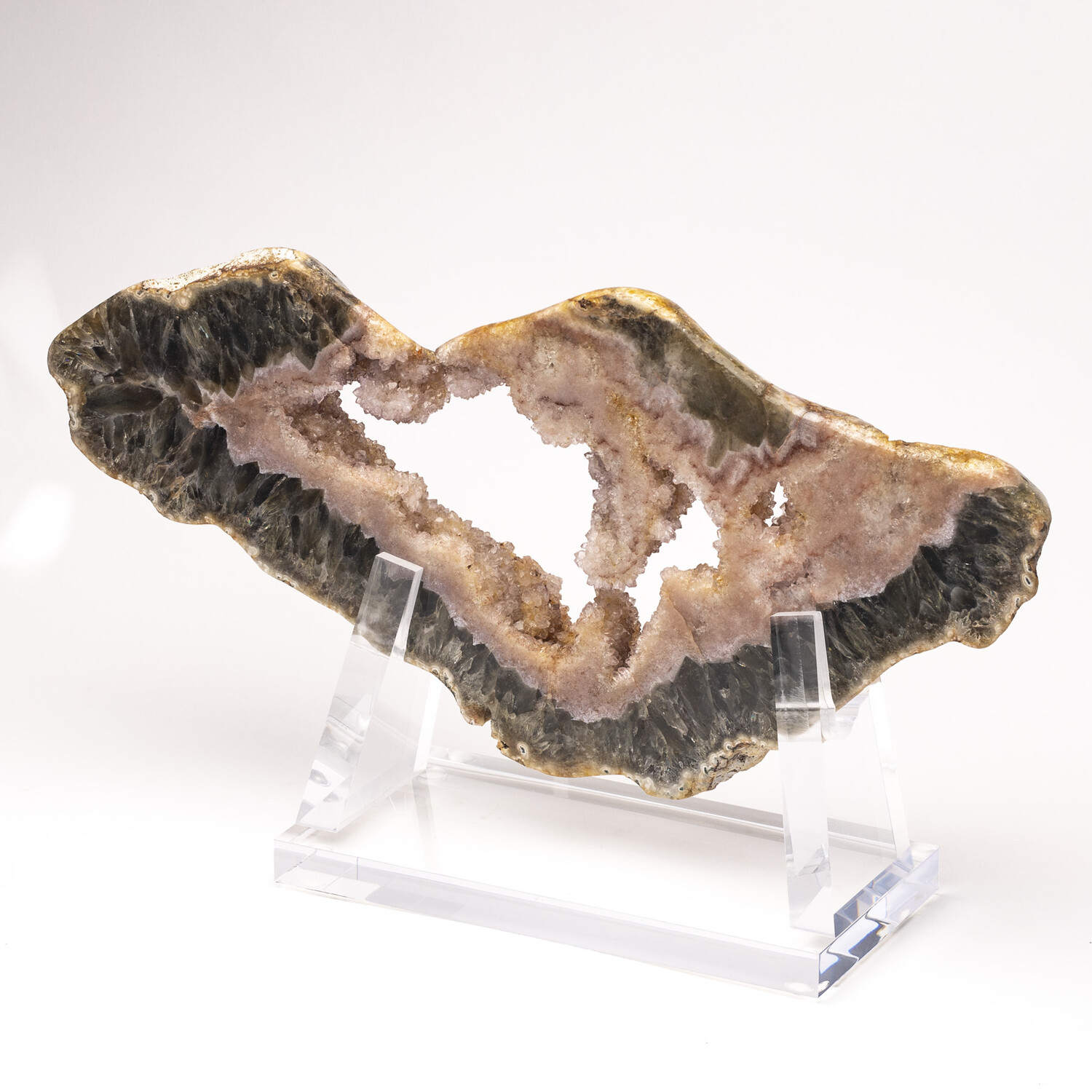 This beautiful Large Brazilian Agate Slab combination of white quartz with pink crystals, forming a very interesting shape mounted on a custom acrylic base