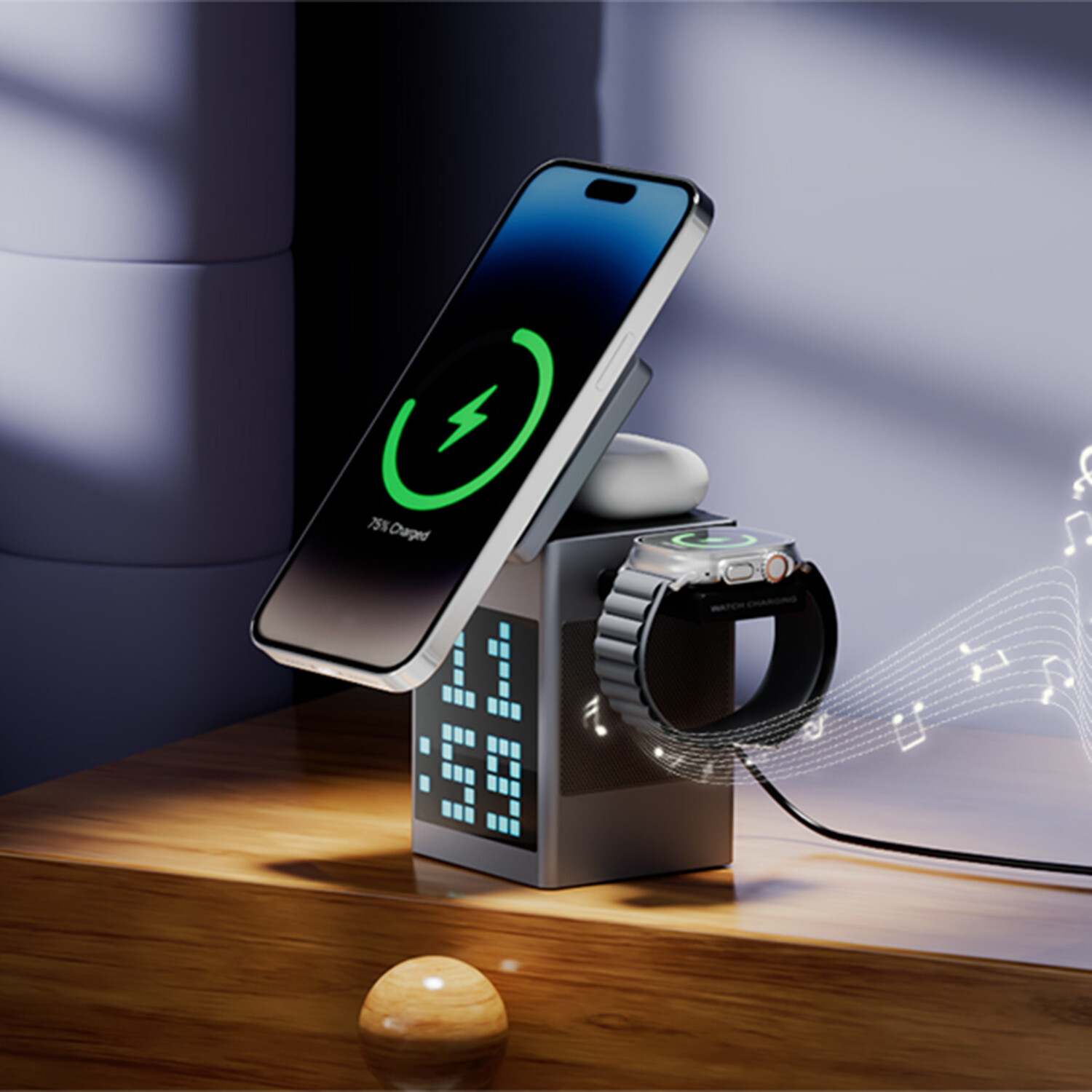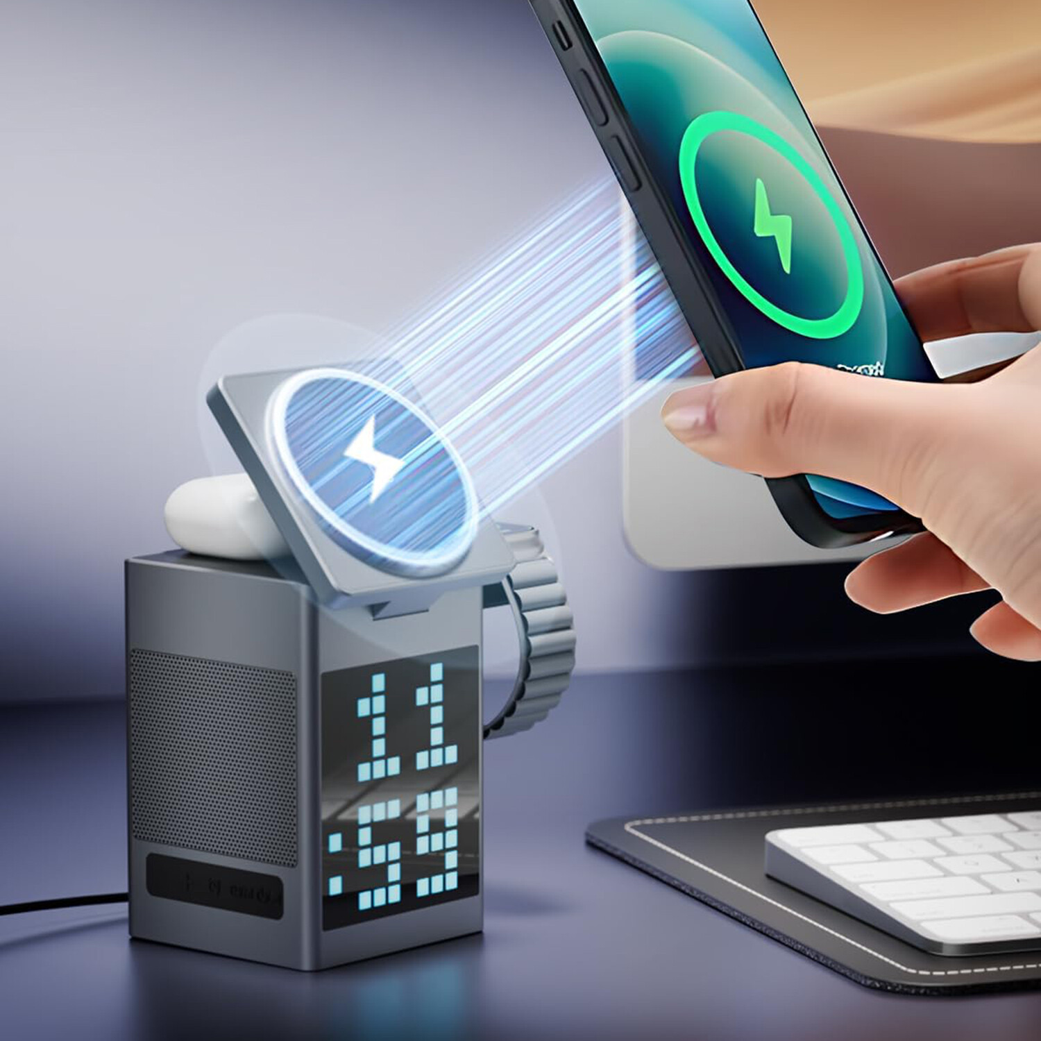 Streamline your tech setup with the Pixelcharge 3-in-1 Bluetooth Speaker & Wireless Charger, a multifunctional device designed for convenience, performance, and style. With fast wireless charging, immersive audio, and a customizable pixel display, this sleek, travel-ready unit brings together everything you need—without the clutter.