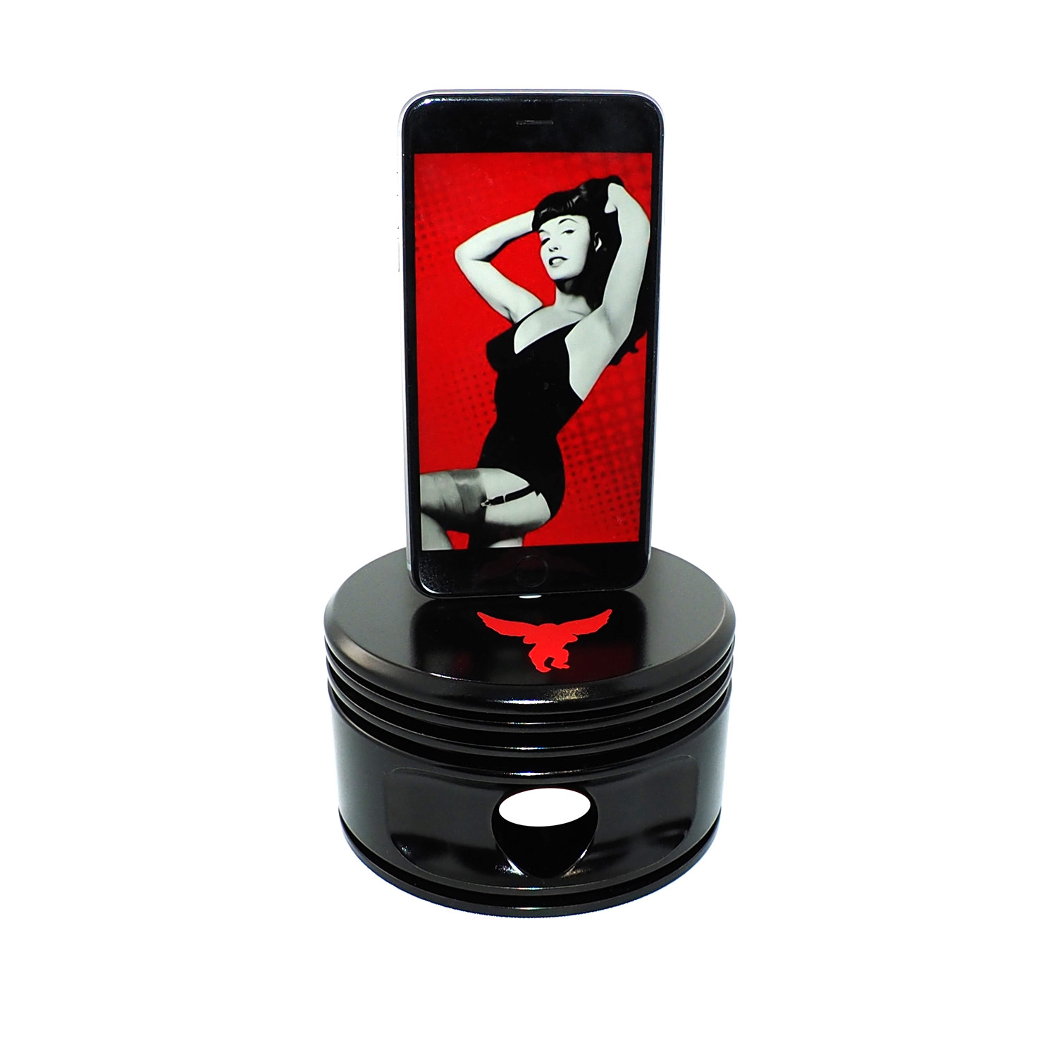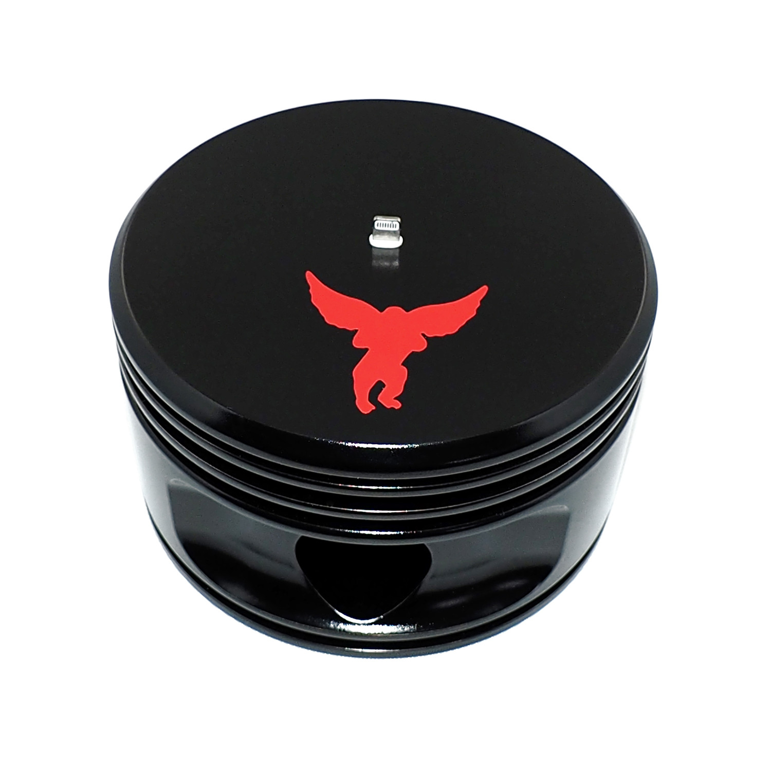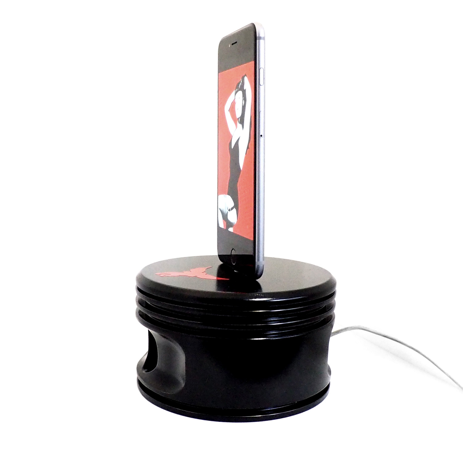 The J-Cobs Piston Dock for Lightning devices works with all iPhones (iPhone 5 5s 5c 6 and 6 plus), iPods, and iTouches using the Lightning Adapter). This industrial modern art Piston Dock was created using a 1940's WWII Jacobs R-755 (or often called the L-4) radial engine piston. The R-755 was used during World War II and powered airplanes including the Avro Anson, Cessna T-50, Avro Cadet, Anahuac Tauro, Cessna AT-17, Cessna 195, Funk F-23, Grumman Ag Cat, Kellett KD-1, Morane-Saulnier MS-505, Waco CG-15, Waco YKC, YKC-S, YKS-6, Boeing Stearman 75 and the Beechcraft Staggerwing.