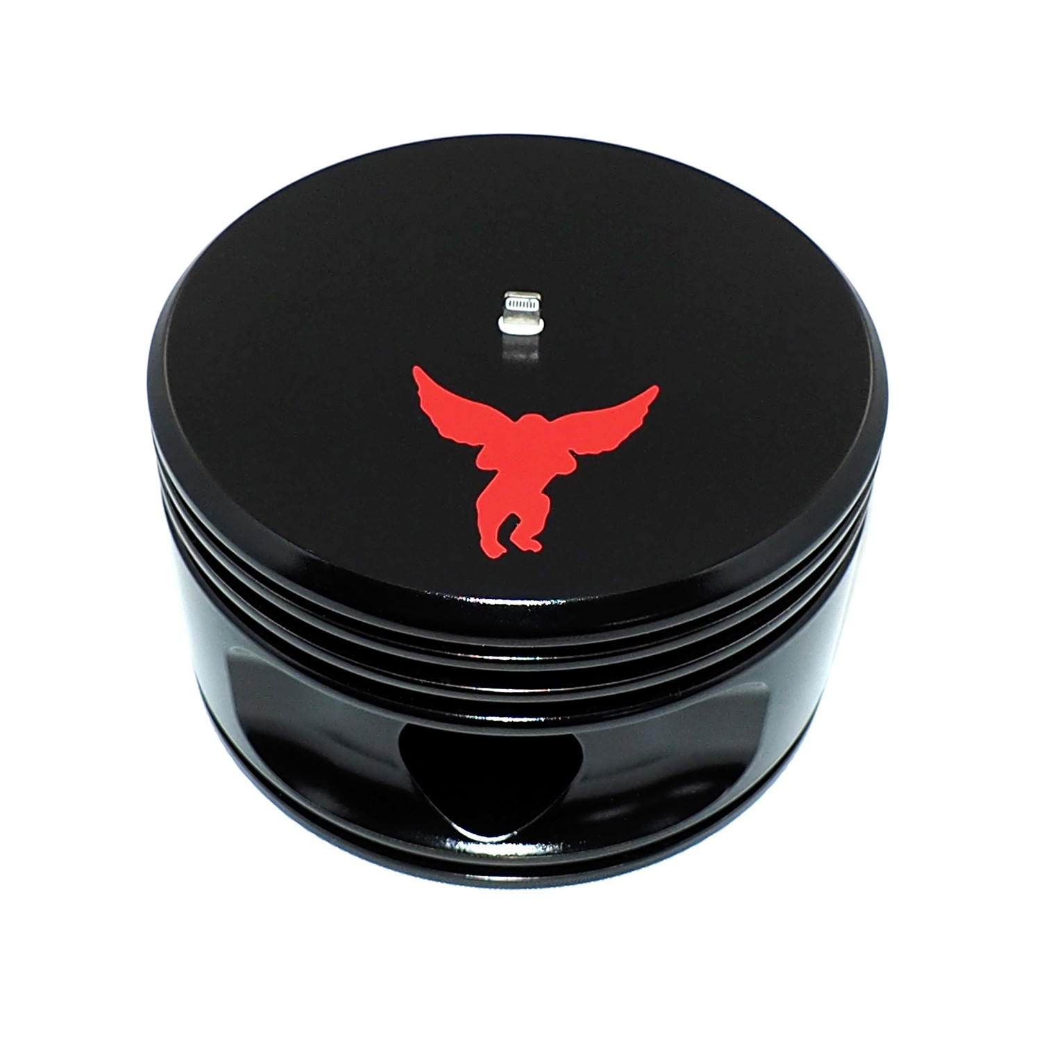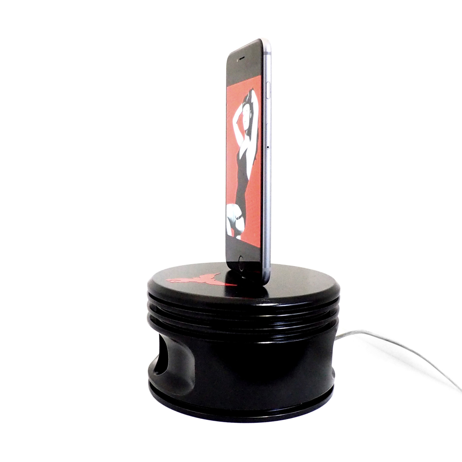 This industrial modern art iPhone Radial Piston Charging Dock was created using a 1940's WWII Jacobs R-755 (or often called the L-4) radial engine piston. The R-755 was used during World War II and powered airplanes including the Avro Anson, Cessna T-50, Avro Cadet, Anahuac Tauro, Cessna AT-17, Cessna 195, Funk F-23, Grumman Ag Cat, Kellett KD-1, Morane-Saulnier MS-505, Waco CG-15, Waco YKC, YKC-S, YKS-6, Boeing Stearman 75 and the Beechcraft Staggerwing.