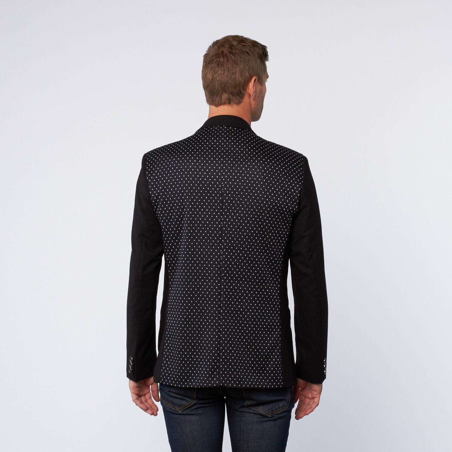 A dapper statement unto its own, the Dot Blazer is the perfect piece for dressing up. Its polka dot body is offset cleverly by a solid lapel and sleeve.