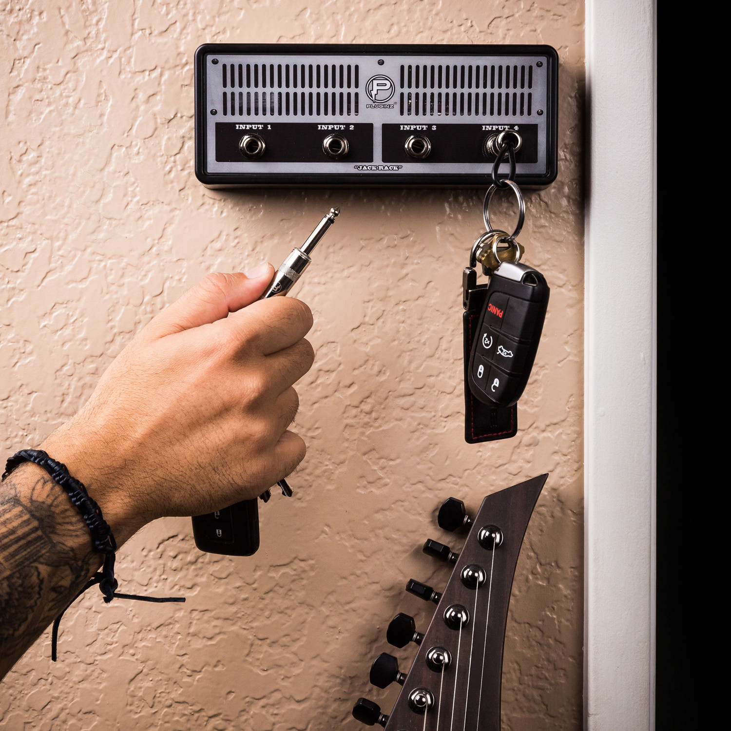 Give your entryway a burst of edgy, rock'n'roll style and keep the keys for the studio looking great in plain site with the Ruckus Jack Rack. Made from 1/8" thick injection molded plastic, this functional and fashionable piece is decorated with a custom amp style decal that puts a unique twist on common key hooks. Simply plug your keys in with one of the four included keychains, and feel like a rockstar everytime you enter the door.