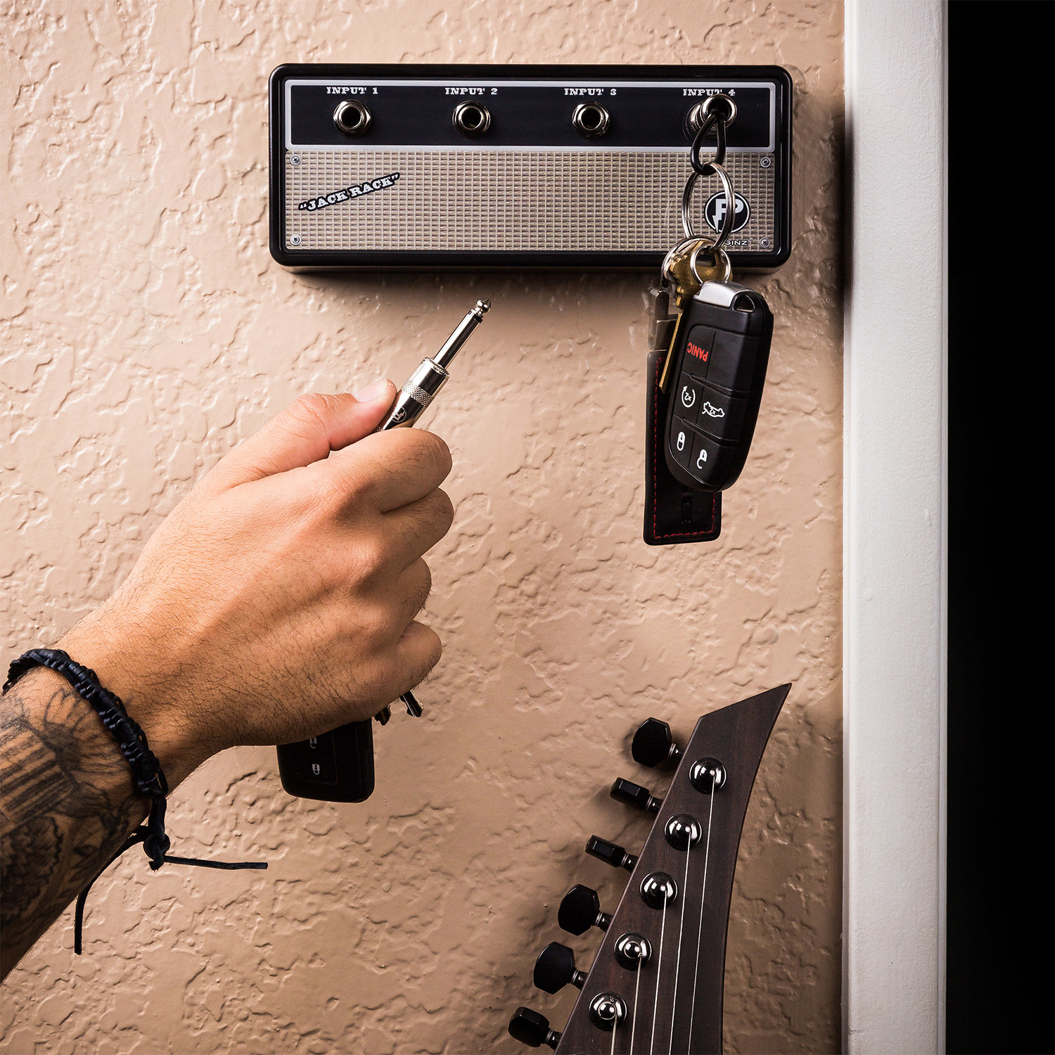 Give your entryway a burst of edgy, rock'n'roll style and keep the keys for the studio looking great in plain site with the Vintage Jack Rack. Made from 1/8" thick injection molded plastic, this functional and fashionable piece is decorated with a custom amp style decal that puts a unique twist on common key hooks. Simply plug your keys in with one of the four included keychains, and feel like a rockstar everytime you enter the door.