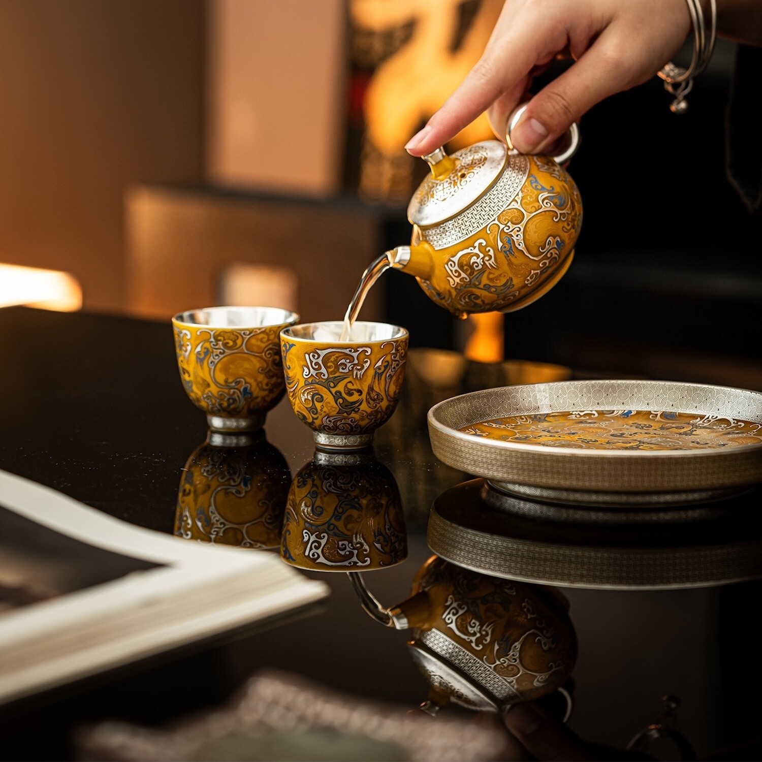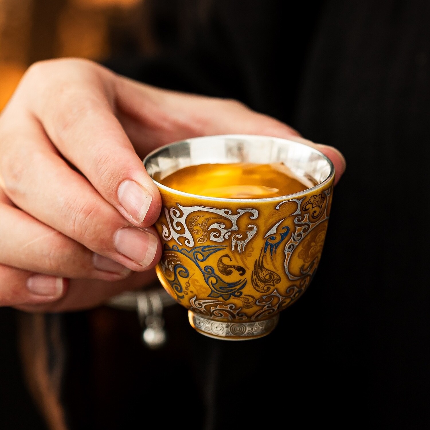 The Draco Aureus Silver-Lined Cup — where imperial majesty meets modern craft. Hand-finished porcelain infused with tradition and innovation: a radiant imperial yellow glaze, a pure silver interior that magnifies every drop of tea or whisky, and the legendary dragon-in-motion motif. More than drinkware, it is a conversation piece, a collectible, and a ritual object. From Gongfu tea to late-night whisky, it transforms every pour into an experience of strength, elegance, and presence.