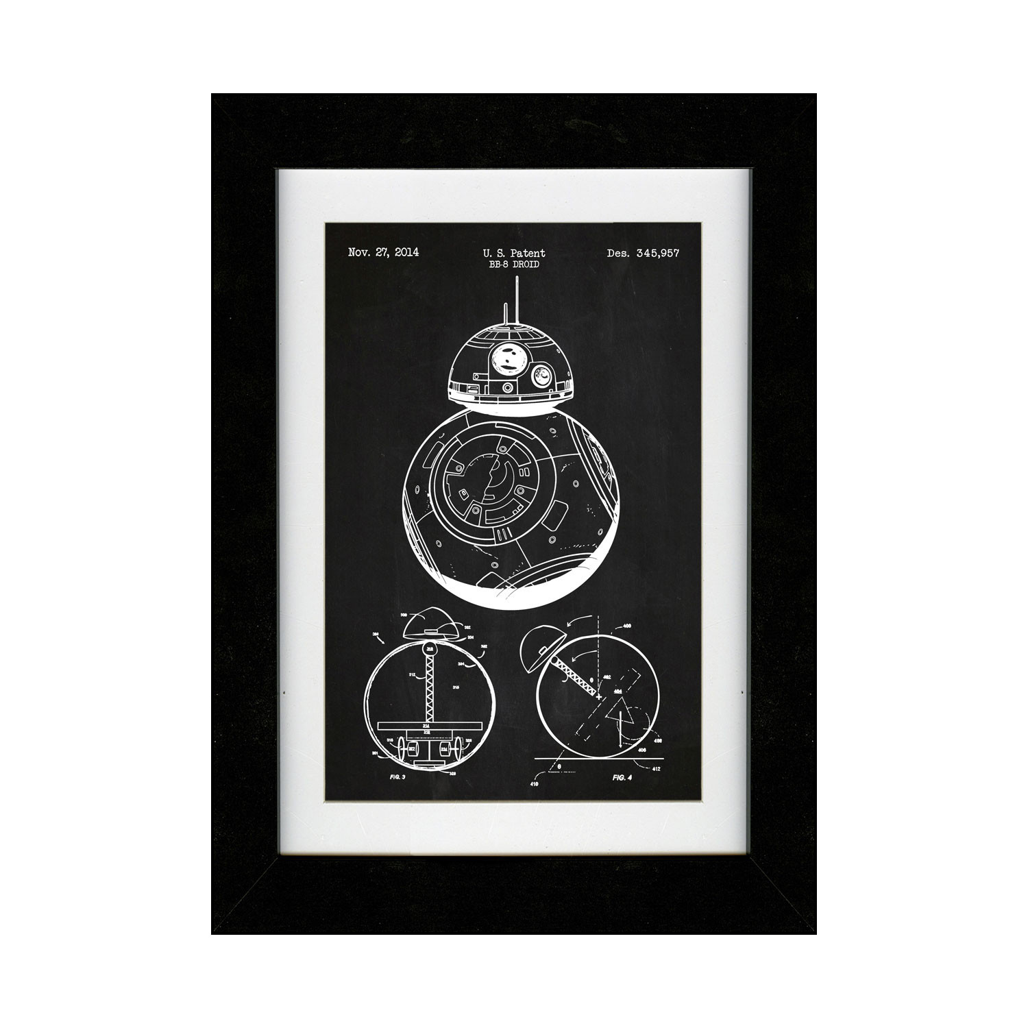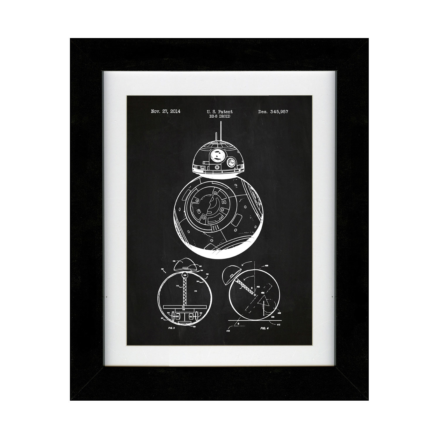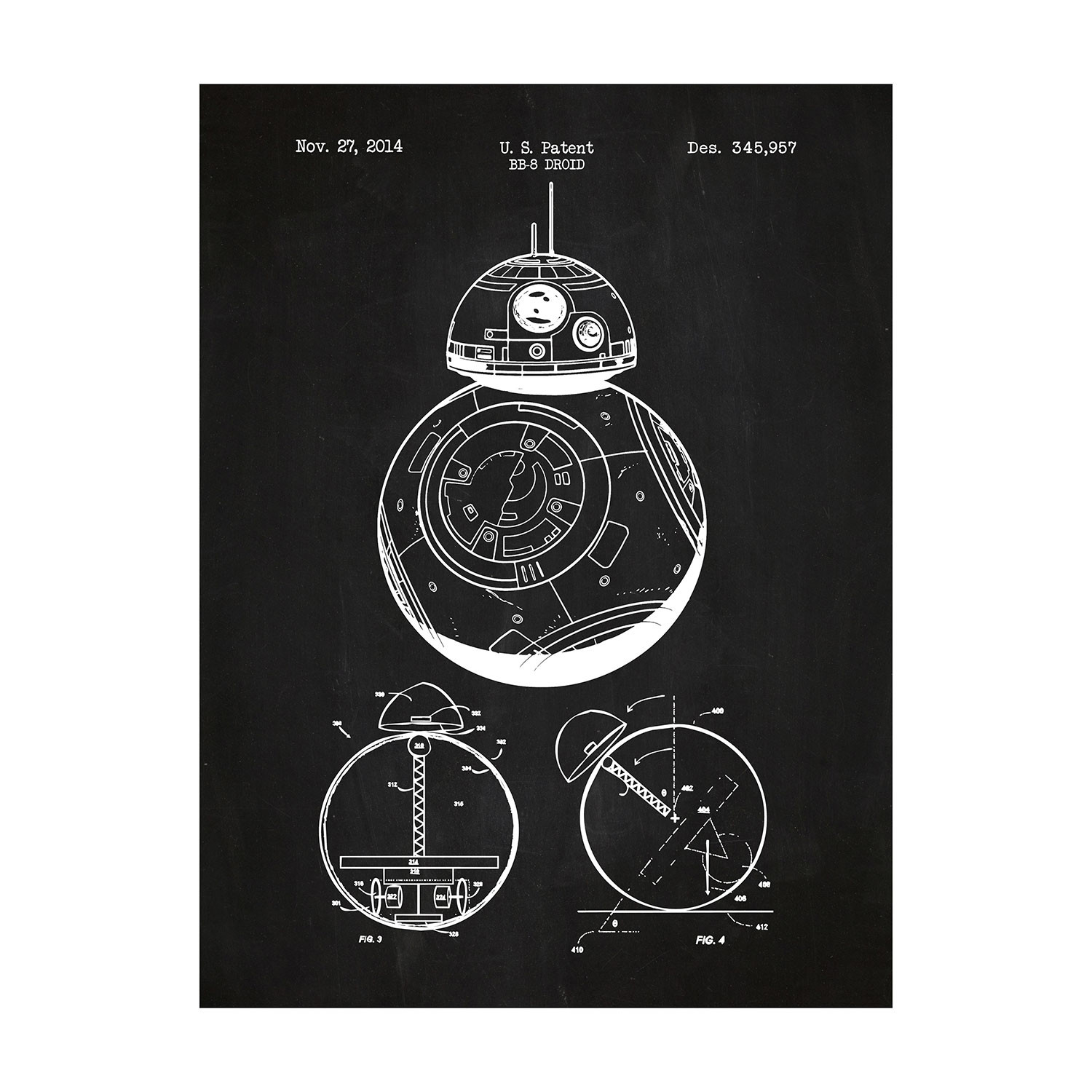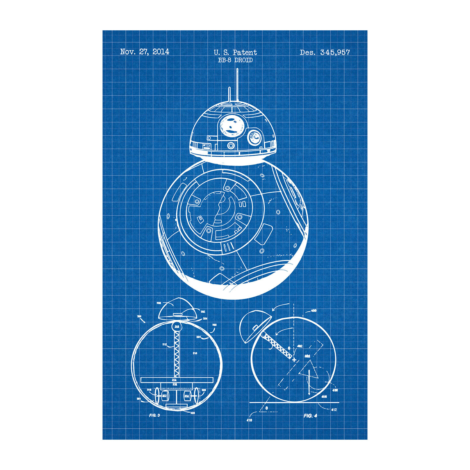 Rendered with acrylic ink on top of thick, high quality 100 lb. paper, this patent print of BB-8 has stemmed from the inspiration of the original creators. Screen printed artwork can be identified by its thick raised ink, which seems to catch the eye from every angle. By hand printing every order, its artists create a prominent depth of field and texture on each poster.