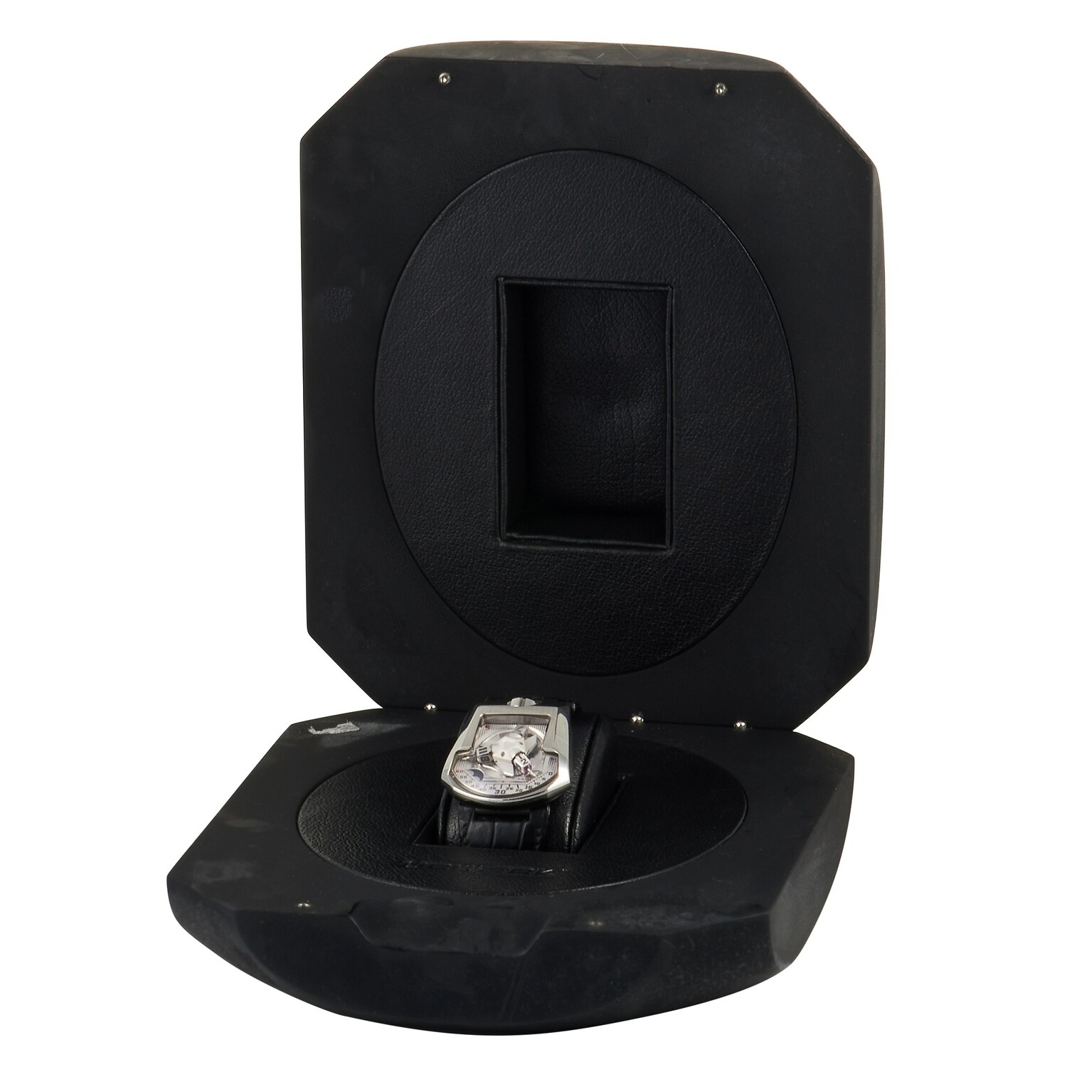 This timepiece contains Urwerk's patented satellite complication protected by a bespoke sapphire crystal. On the dial are three rotating cubes mounted on the arms of a bladed center carousel. Each cube has four hour markers and it spins to the correct numeral as the hour changes. The hour pointer where each cube is mounted slides or telescopes to point to minutes. Found at the lower portion of the dial are the moonphase and day/night indicators. Everything on the dial is fully lumed so you never have to worry about nighttime legibility.