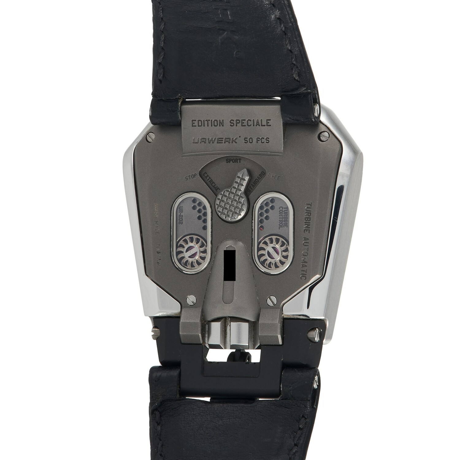 This distinctive creation by Urwerk comes fitted with a black leather strap. Offered in pre-owned condition, this Urwerk Hammerhead Steel Limited Edition Men's Watch UR-202S comes complete with papers and the manufacturer's box.