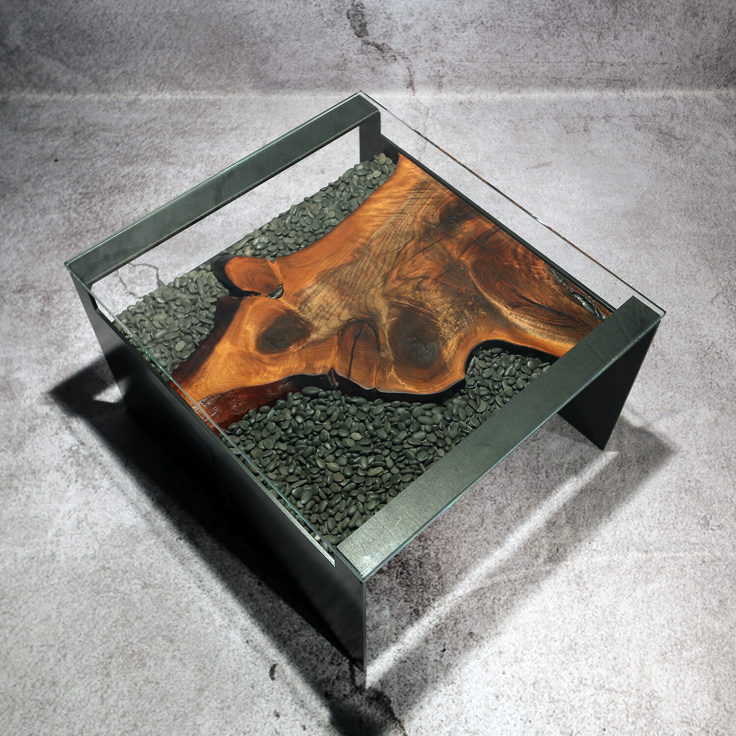 Kojima is a completely unique cocktail table showcasing a highly figured black walnut. This gorgeous piece was conceived as an island extending into the sea. The legs are inspired by origami—cut and folded from a single piece of plate steel. Trimmed in leather and topped with ultra clear museum glass, this table is finished with loose tumbled stones that meet up to the infinity edge of the piece to complete the dramatic composition. This one-of-a-kind table was carefully handcrafted by the artist and includes a signed certificate of authenticity.