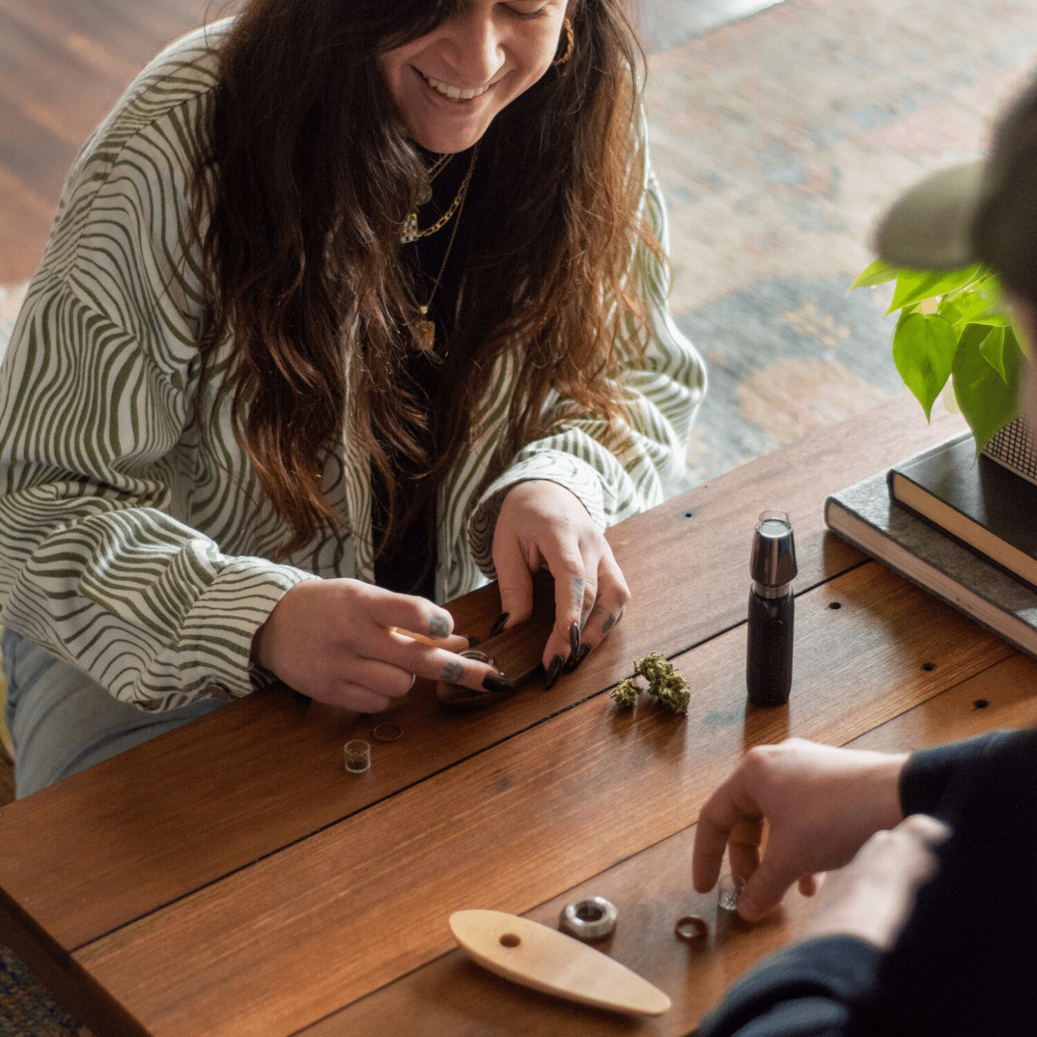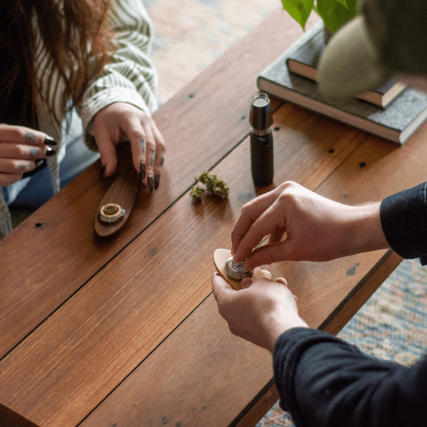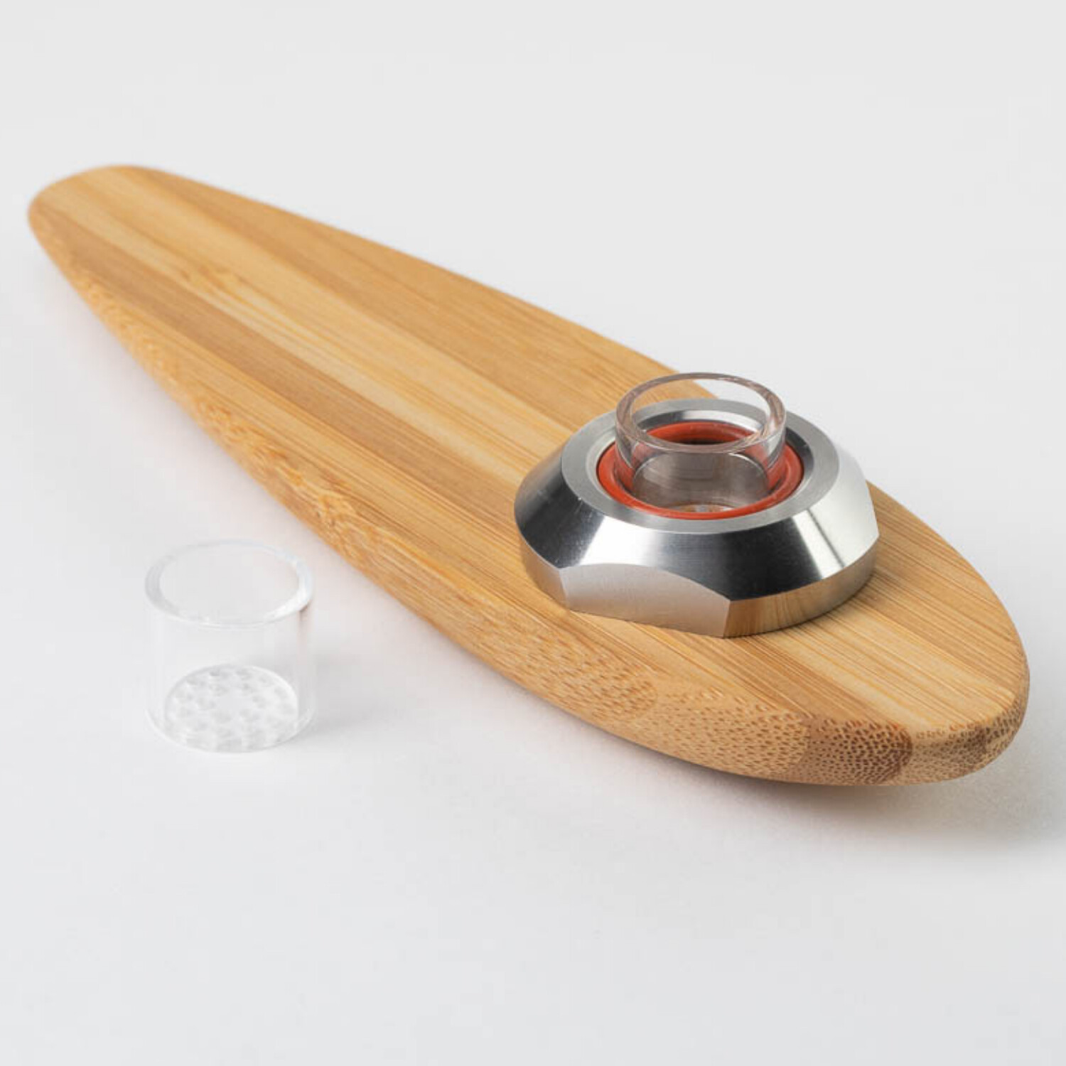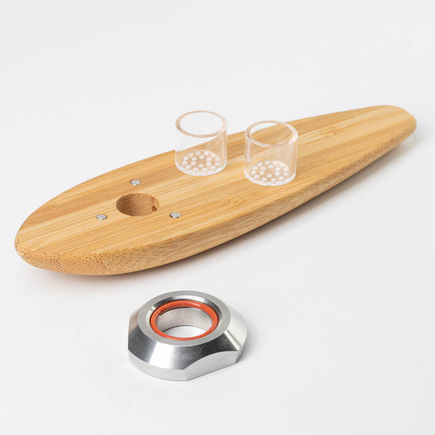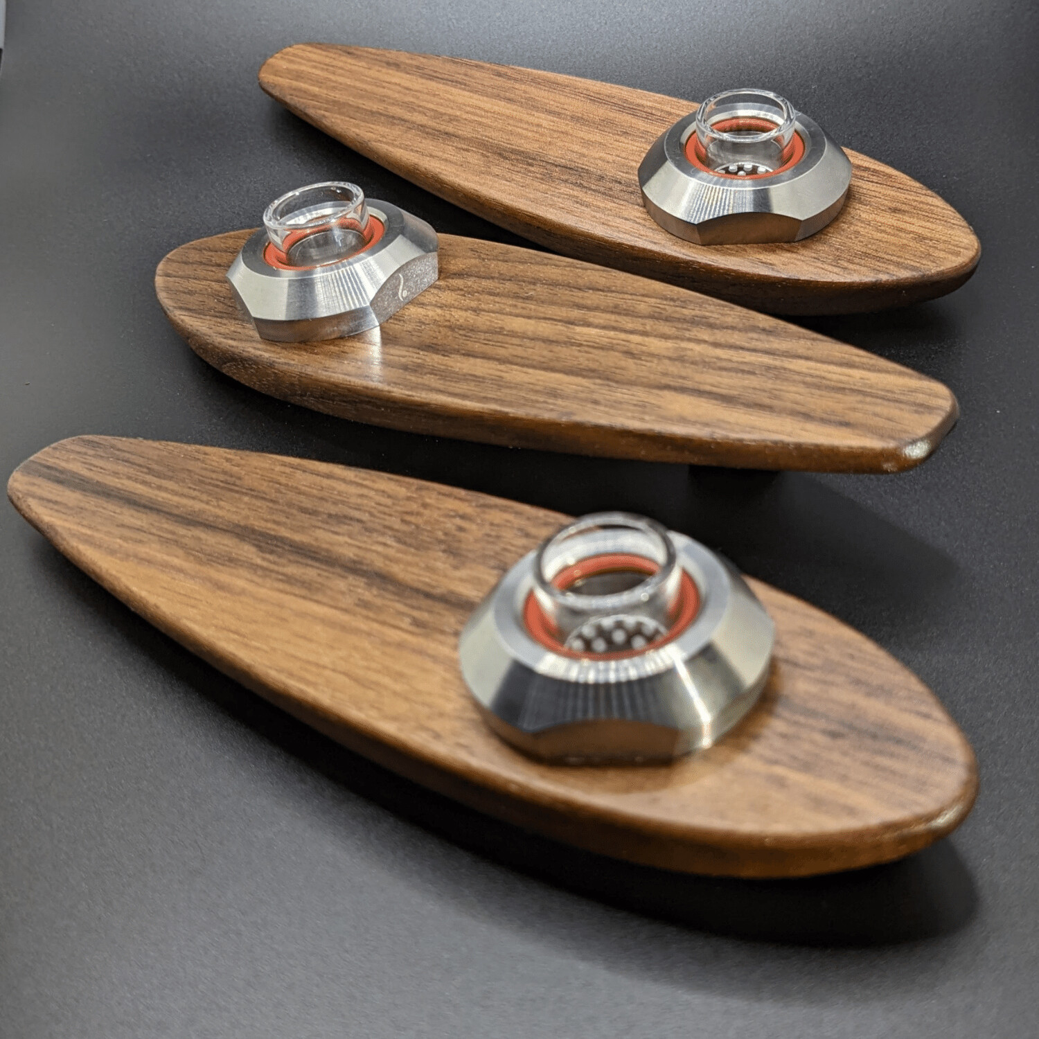The Terp Surfer pipe has a modular design that allows for easy preparation, sharing, and cleaning. The three-part system is made of the walnut deck, titanium docking ring that attaches to the deck with powerful magnets, and a quartz herb capsule that fits snugly inside the titanium docking ring.