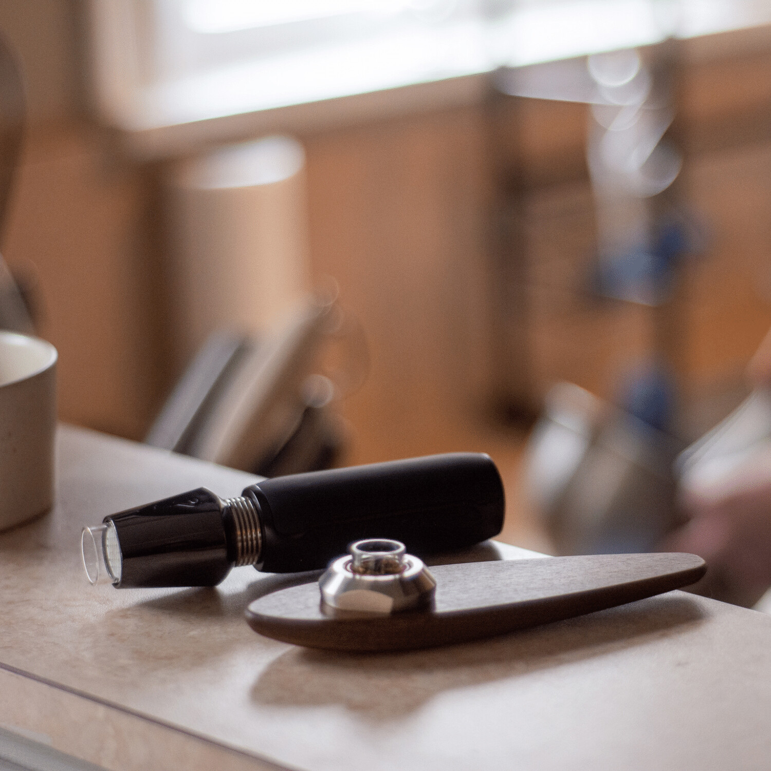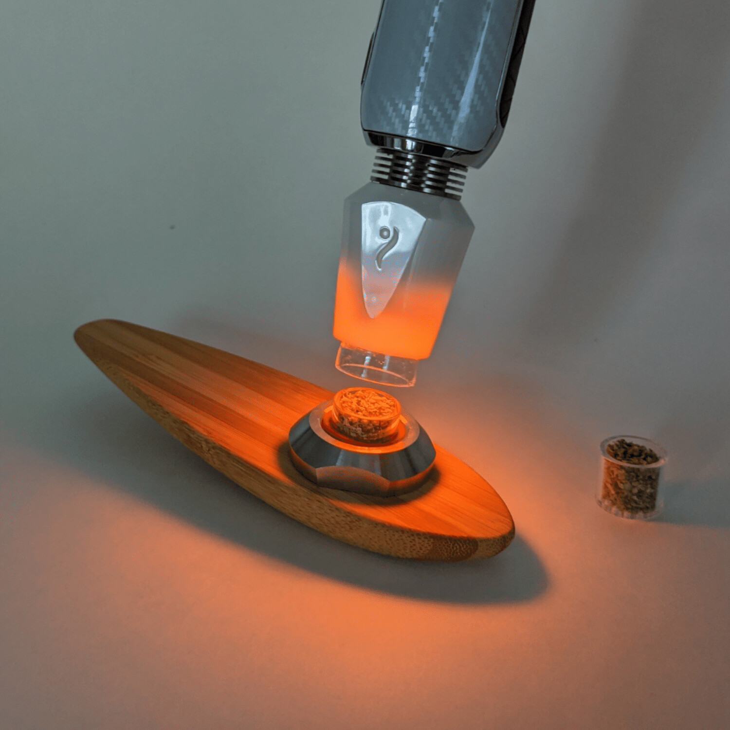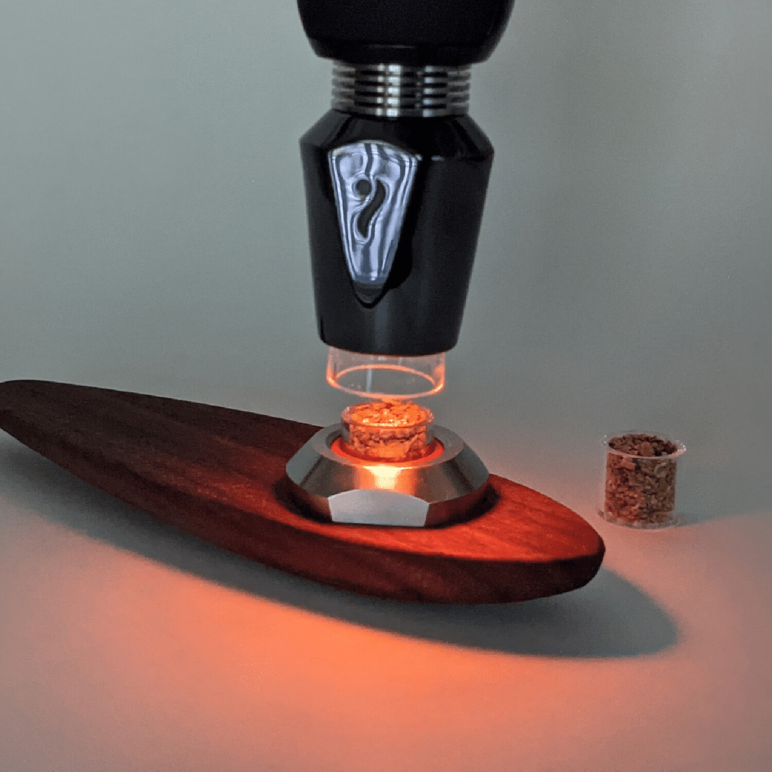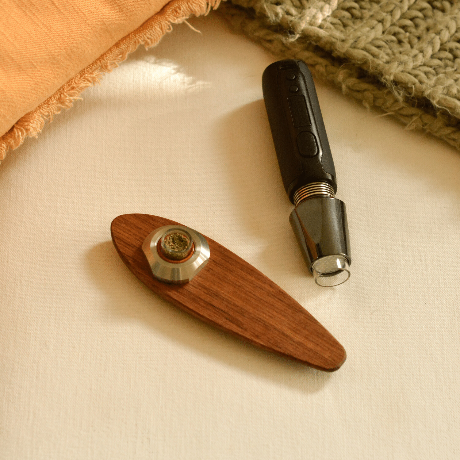 While the vast majority of pipes have a single hole at the bottom of the bowl, the Terp Surfer uses swappable quartz herb capsules with numerous holes to spread the airflow evenly. This optimizes extraction and results in rich, dense vapor that’s loaded with flavor. The capsules are easily cleaned and can be pre-loaded with different blends for sampling, or for longer sessions with friends. The titanium docking ring stays cool to the touch and can be removed for sharing, easy cleaning, and storing. The rich walnut deck adds a beautiful, organic feel while also serving an amazing insulator. This minimizes the build up and loss of essential oils due to condensation, resulting in better effects and less cleaning.