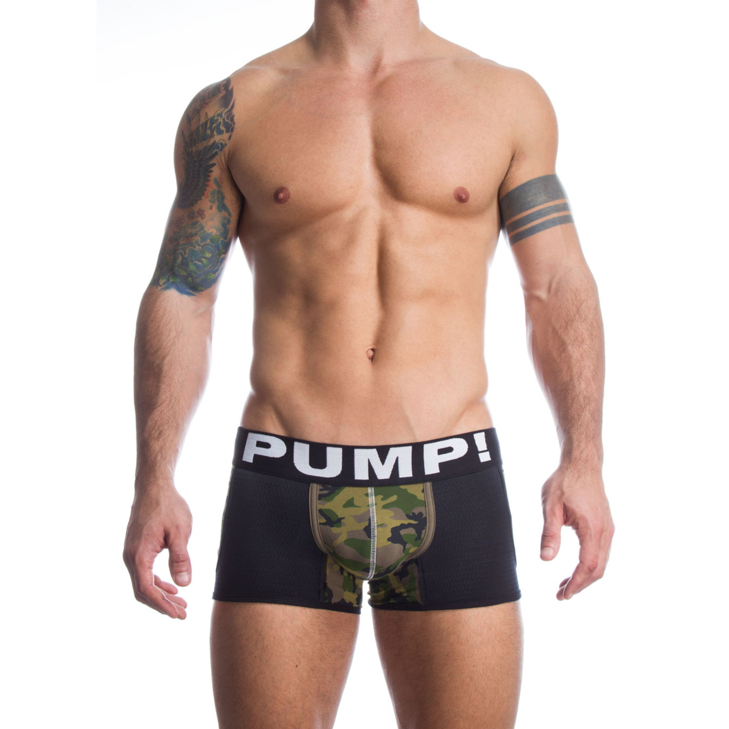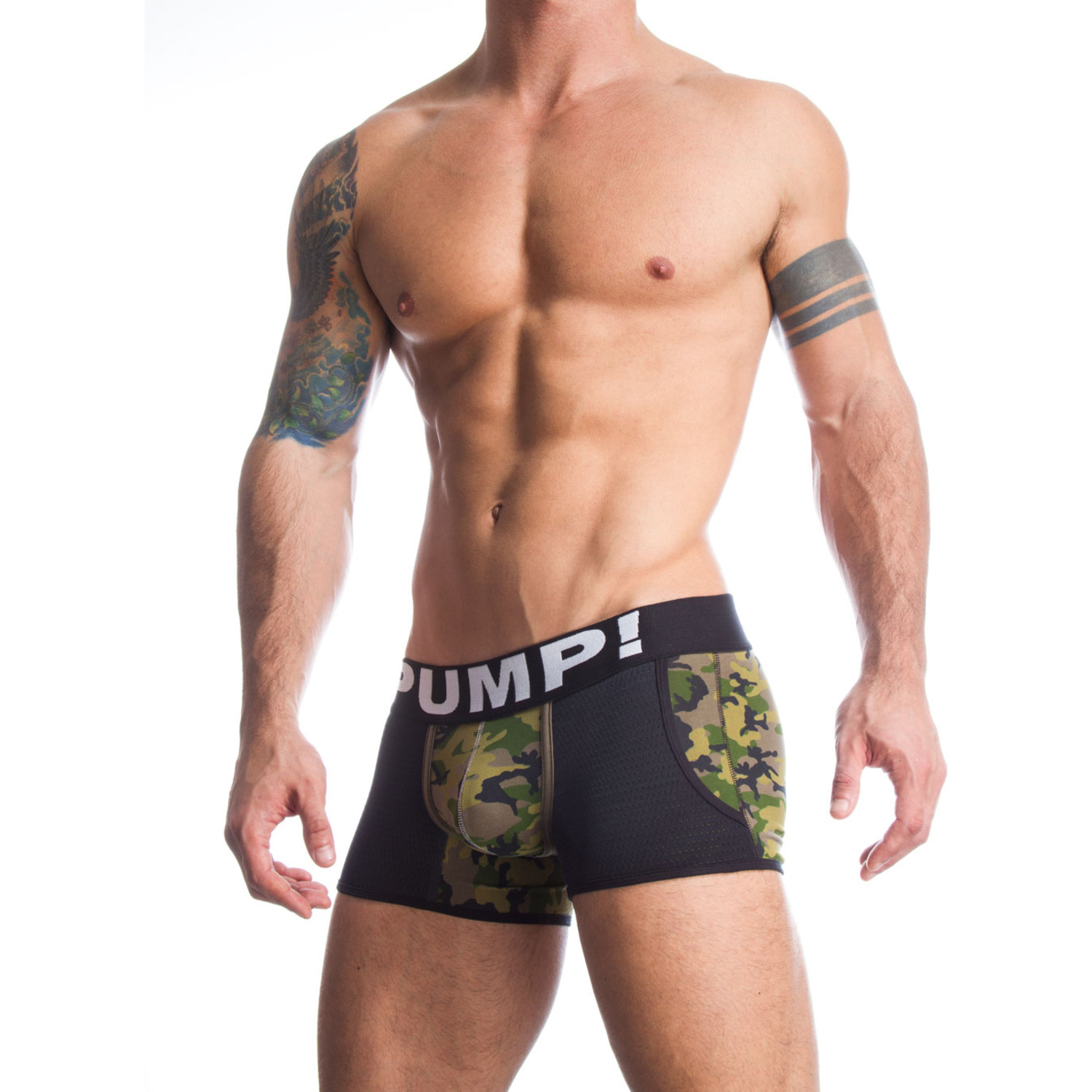 This camouflage pattern won't make you fade into the background because we placed it right where you want it, emphasizing the cup and your butt. The camouflage is made of soft, comfortable cotton with breathable black mesh pockets over top for lounging. These boxers attract a lot of attention, and in the concrete jungle, that's just the way you want it.